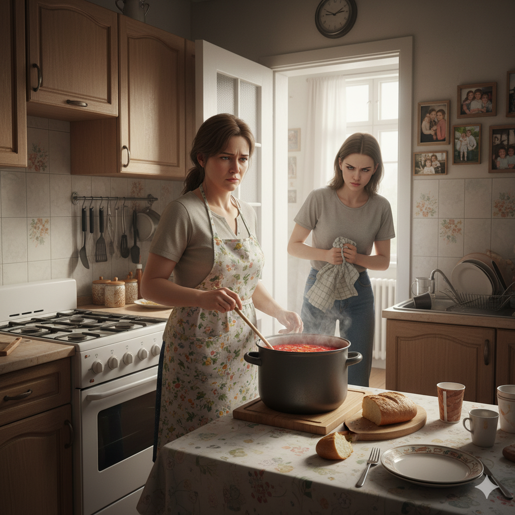 Я застыла с половником в руках над кастрюлей борща. Красные капли медленно стекали с ложки обратно в кипящий суп, а на кухне повисла такая тишина, что слышно было только бульканье на плите.