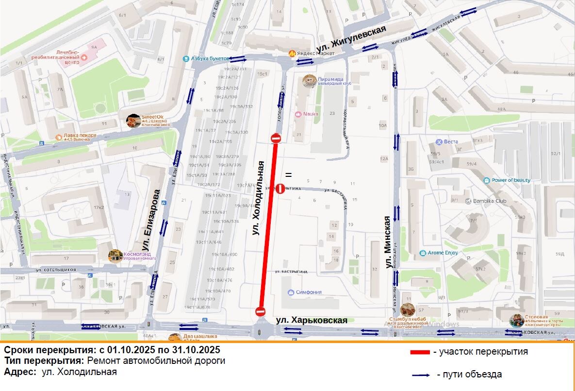 В связи с выполнением работ по ремонту автомобильной дороги в период с 01.10.2025 по 31.10.2025 планируется прекращение движения по ул. Холодильной от дома № 21 до ул. Харьковской. Участников дорожного движения просим обращать внимание на знаки, заранее планировать маршрут, соблюдать Правила дорожного движения РФ. Возможные маршруты объезда: ул. Харьковская, ул. Елизарова, ул. Минская.
