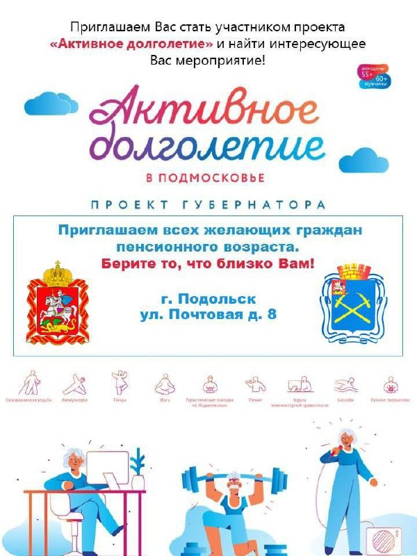 ✨ Приглашаем в клубы Активное Долголетие 💪Нашим долголетам не приходится скучать: они занимаются спортом, участвуют в различных мастер-классах, путешествуют, осваивают компьютерную грамотность и смартфоны. 👉Они постоянно расширяют кругозор, поддерживают физическую форму и интеллектуальную активность, вдохновляясь новыми знаниями и увлечениями. Приглашаем 👉г. Подольск, п. Кузнечики, 8 👉г. Подольск, ул. Почтовая, 8 🚫 Возраст: 55+ 💰 Вход свободный❗️ ⭐Поддержать канал голосом 💰 Вакансия - курьер в Подольске ✅ Мероприятия Подольск https://dzen.ru/id/66ed500f7b5671493eca3fd6 http://vk.com/podolsk_events http://dzen.ru/podolsk_events