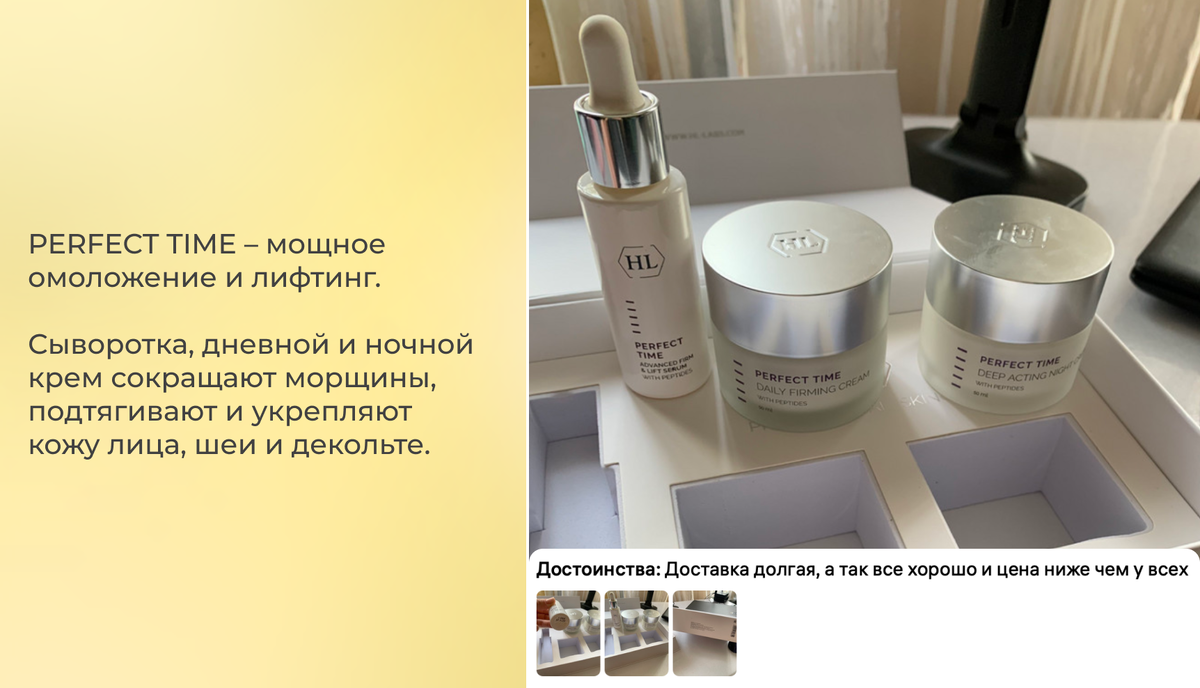 В рубрике «Отзывы» рассказываем о профессиональном антивозрастном уходе, который завоевал популярность у наших клиентов — Holy Land Perfect Time Kit. Набор создан для комплексного ухода за кожей с первыми признаками возрастных изменений и включает три полноразмерных средства: Набор идеально подходит для кожи после 30 лет или при первых признаках снижения тонуса. Используйте его как полноценный ритуал: утром — сыворотка и дневной крем, вечером — сыворотка и ночной крем. Все средства аккуратно уложены в прочную стильную коробку с фиксирующими ячейками — удобно хранить дома и брать в поездку. «Доставка долгая, а так всё хорошо и цена ниже, чем у всех».