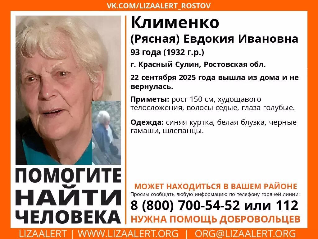В Ростовской области к поискам без вести пропавшей 93-летней Евдокии Клименко привлекли автомобилистов. Волонтеры просят водителей, которые проезжали в городе Красном Сулине от улицы Шоссейной, 2 до переулка Русского, 45 и от переулка 4-го Рабочего, 40 до улицы Тепличной, 72, предоставить записи с видеорегистраторов за 22 сентября с 06:00.