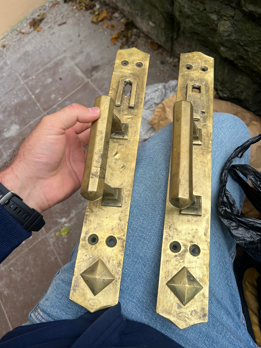 Недавно, гуляя по блошиному рынку в Санкт‑Петербурге, я увидел у одного из продавцов массивные латунные ручки. Они были тяжёлые, с хорошей фактурой — как только я их заметил, решение принялось мгновенно. Продавец назвал цену — 5000 руб. за пару. Я не думал: достал деньги, отдал и ушёл с покупкой. Просто потому что они мне понравились — красивые, ощутимые в руке, с характером. Думаю, когда‑нибудь они найдут своё место в интерьере. На ручках выбиты клейма «Братья Щербаковы». «Щербаковъ» это — марка известной скобяной мануфактуры из Тулы, в XIX–начале XX века. Клейма щербаковской мануфактуры изменялись вместе с поколениями: на ранних изделиях встречалось «Т.Г.В. Щербаковъ», позже — «Бр. Щербаковы» или «Николай и Иван бр. Щербаковы». С одной из ручек Николая Щербакова связана красивая легенда: в жаркий день он заметил свою ручку на двери. Дотронувшись до фигуры, он увидел, что дверь распахнулась, и на пороге стояла девушка — будущая жена. С тех пор прикосновение к льву стало считат