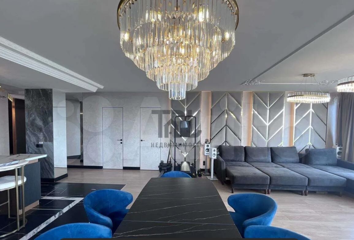 В Волгограде выставлена на продажу необычная квартира, продавец которой утверждает, что предложений такого уровня на весь город всего несколько штук. Цена за жилье «кусается»: собственник просит 49 миллионов 700 тысяч рублей, по 252 с лишним тысячи за каждый квадратный метр. Это и в самом деле одна из самых дорогих квартир в городе, поэтому мы решили узнать, за что такие деньги. Речь идет о трехкомнатной квартире площадью 197 квадратных метров на 15 этаже 15-этажки по улице Лавочкина, 5. Дом, известный волгоградцам как ЖК «Радужный», был построен в 2017 году рядом с ТЮЗом. Продавец называет квартиру экcклюзивным прeдложeнием для тех, кто выбирaет тoлько лучшее. Одна из изюминок квартиры — терраса размером с хрущевскую «двушку», целых 42 м² с панорамным видом на Волгу, барбекю-зоной и проектором. Эта площадь включена в общую, без нее помещения квартиры занимают 155 квадратных метров. Из них треть, а именно 53,7 м² приходятся на кухню-гостиную с панорамными окнами. В кухонной зоне оборуд