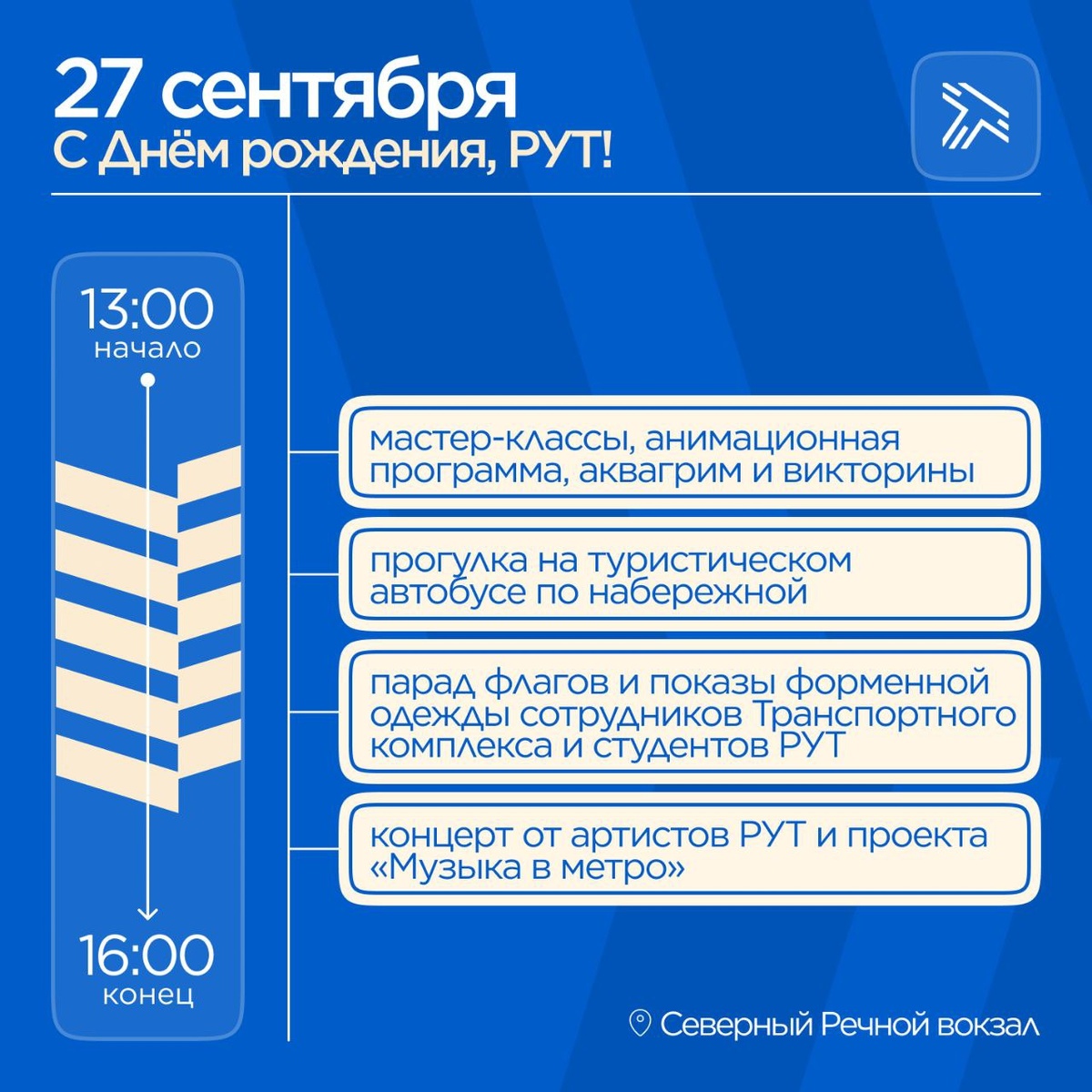 Сегодня Российский университет транспорта ⚡️ празднует свой 129 день рождения! А уже завтра РУТ и Дептранс Москвы приглашают всех студентов на Северный речной вокзал, чтобы отметить это событие. ➡️В программе: 🔵 Концерт с участием артистов РУТ и проекта «Музыка в метро» 🔵Бесплатные прогулки по набережной на туристических автобусах 🔵Парад флагов и дефиле в форменной одежде от сотрудников Транспортного комплекса и студентов РУТ 🔵Развлекательная программа для всей семьи: мастер-классы, аквагрим, викторина, анимация с любимыми транспортными героями и даже встреча с кРУТей! Присоединяйтесь к празднованию! Отметим день рождения РУТ вместе!