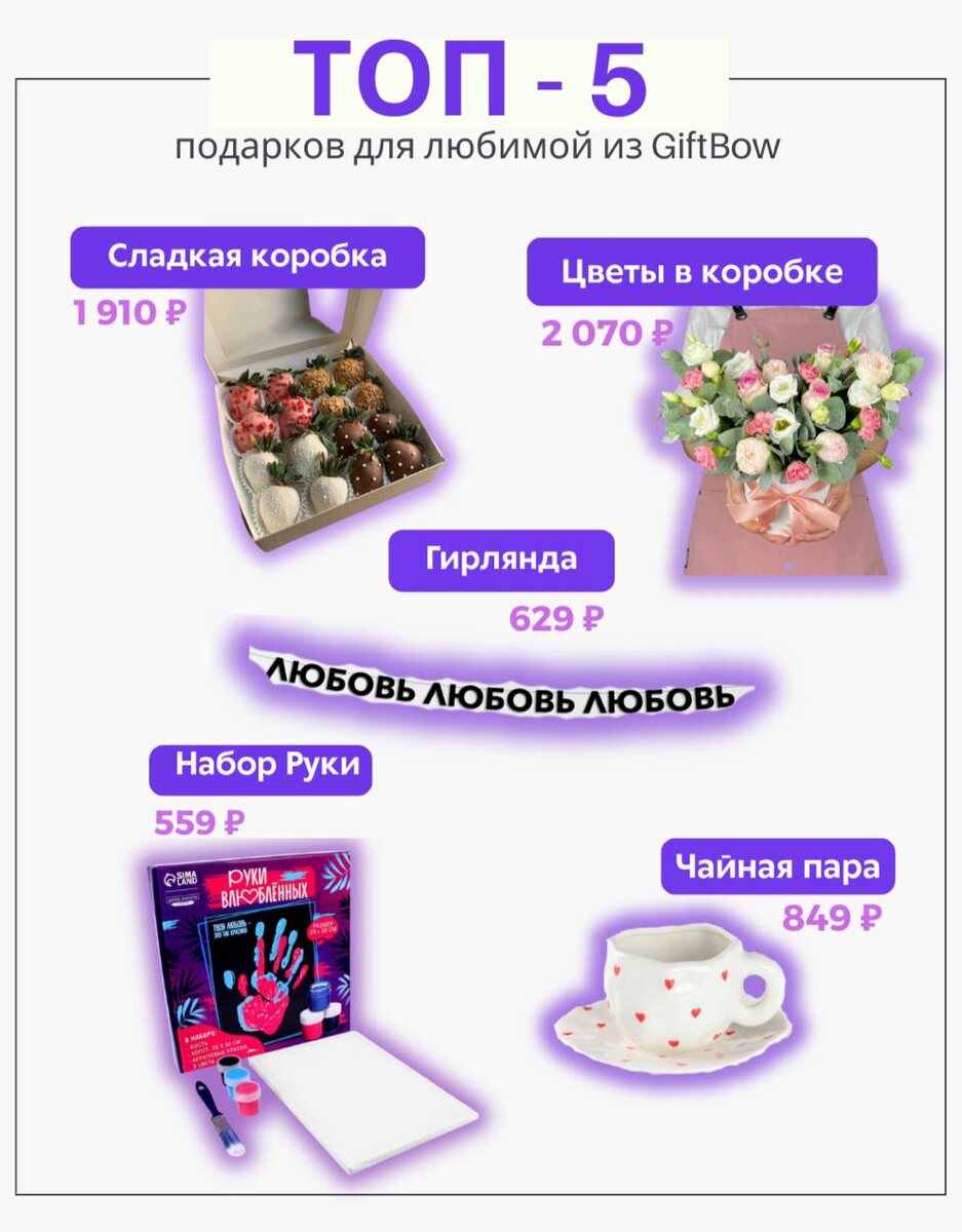 🥰❤️Хочу порадовать любимую, но не знаю как… Не переживайте! Делимся классными идеями для приятного сюрприза из GiftBow ❤️🔥 📍Сладкая коробочка — 1 910 ₽ 📍Цветы в коробке — 2 070 ₽ 📍Набор «Руки» — 559 ₽ 📍Гирлянда — 629 ₽ 📍Чайная пара — 849 ₽ ✨А ещё больше идей ищите в GiftBow — добавляйте в вишлист, чтобы не забыть! @giftbowru #wishlistнедели