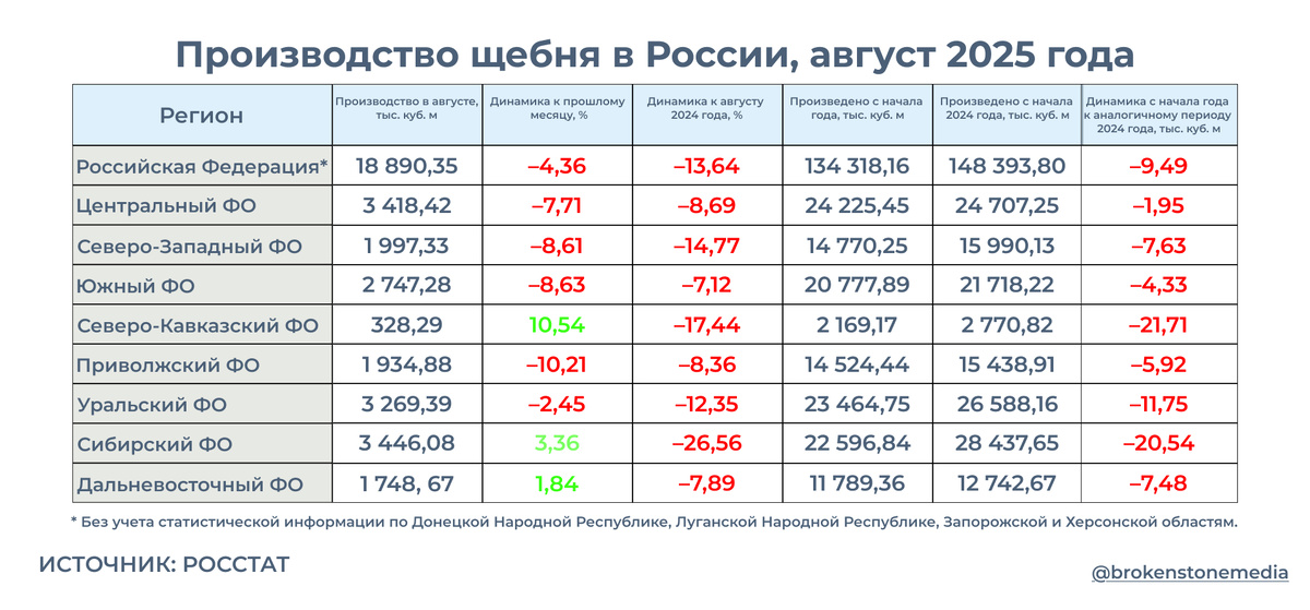 Росстат опубликовал данные по производству щебня в августе 2025 года. За месяц в России получено 18,9 млн куб. м (26,4 млн тонн). По отношению к августу 2024 года производство щебня в стране снизилось на 13,6%. Относительно аналогичного периода прошлого года положительную динамику не показал ни один федеральный округ. Наиболее сильное падение показателей зафиксировано на предприятиях в Сибирском (–26,6%) и Северо-Кавказском (–17,4%) федеральных округах. По отношению к прошлому месяцу рост зафиксирован в трёх федеральных округах: Северо-Кавказском (10,5%), Сибирском (3,4%) и Дальневосточном (1,8%). В остальных регионах отмечено падение производства. Наибольшие снижение добычи продемонстрировали карьеры Приволжского, Южного и Северо-Западного федеральных округов: минус 10,21%, 8,63% и 8,61% соответственно. С начала 2025 года в стране произведено 134,3 млн куб. м (188,1 млн тонн), это на 9,5% меньше, чем за аналогичный период прошлого года: за восемь месяцев 2024 года было получено 148,