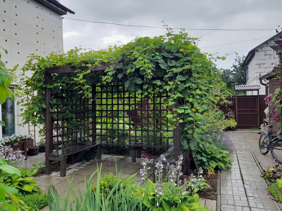 У меня уже есть пара статей про наш забор. Комментарии к ним были разные. Кто-то считает такой забор из профлиста ужасным, а другие им вполне довольны. Лично я для своего участка лучшего варианта не вижу, кто бы что не говорил. На участке тихо, спокойно, никого не видно. Коричневый цвет, на мой взгляд, отличный фон для растений. Да и забора сейчас практически не видно. Большая часть закрыта строениями. Какие-то участки спрятаны за большими шпалерами и перголами. Вся наша дача в зелени, границы не просматриваются. В двух местах высажены живые изгороди. Пока растения малы, но через несколько лет и эти части забора скроются. Бытует мнение, что участок с сплошным забором из профлиста не продувается, металл нагревается на солнце и растения от этого страдают. По фотографиям видно, что мои на страдальцев не похожи. У меня много статей про сад, есть статьи и на других каналах и ни один человек не написал, что ему не нравится наш забор. А когда пишу про забор, обязательно найдутся люди с таки