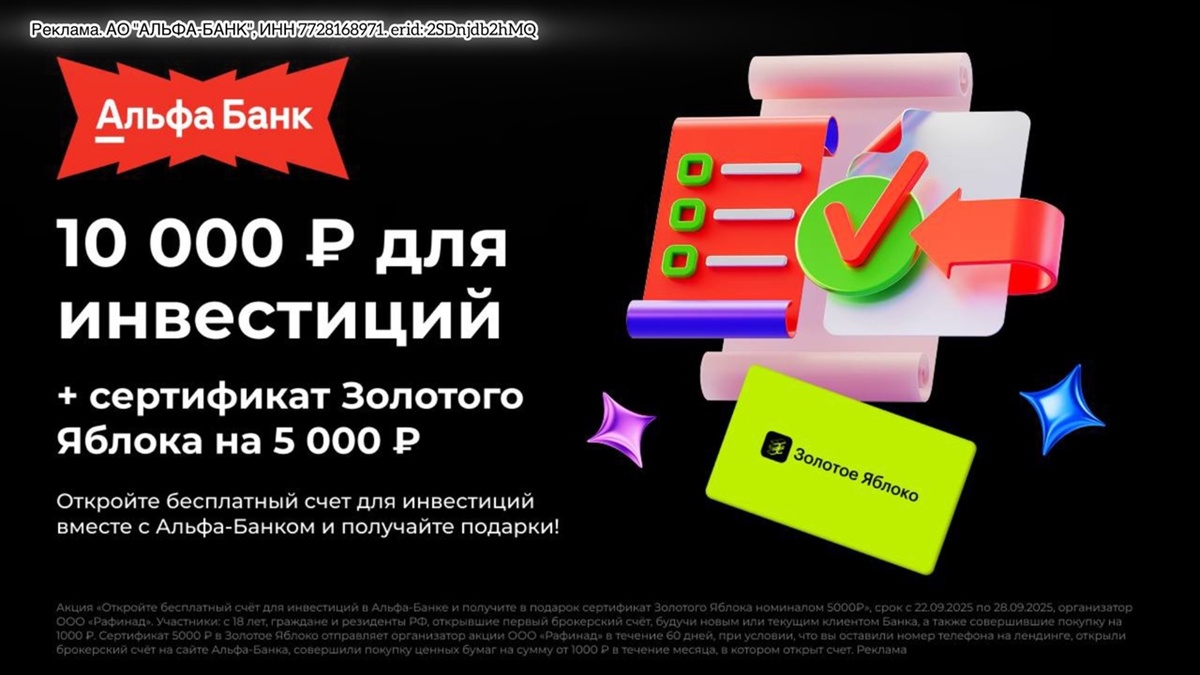АКЦИЯ ЗАКАНЧИВАЕТСЯ‼️‼️‼️ 💸 Альфа-Банк дарит до 10 000 ₽ и сертификат Золотого Яблока на 5000 ₽🔥 Если у тебя ещё нет брокерского счёта — сейчас лучший момент его открыть. 🔹 Сертификат на 5000 ₽ в Золотое Яблоко — Оформи счёт по ссылке — Купи акции на 1000 ₽ — Сертификат придёт по SMS в течение 60 дней До 10 000 ₽ деньгами от Альфа-Банка За инвестиции каждый месяц — от 500 ₽ до 1600 ₽ на счёт: 1 месяц — 500 ₽ 2 месяц — 600 ₽ ... 10 месяц — 1600 ₽ 📍 Всё бесплатно, оформление — за 3 минуты 📉 Сделки — хоть в браузере, хоть в приложении 👉 Оформить счёт и забрать бонусы https://rfnd.io/t/8edsg/?pid=2151&post=3295&erid=2SDnjdb2hMQ.