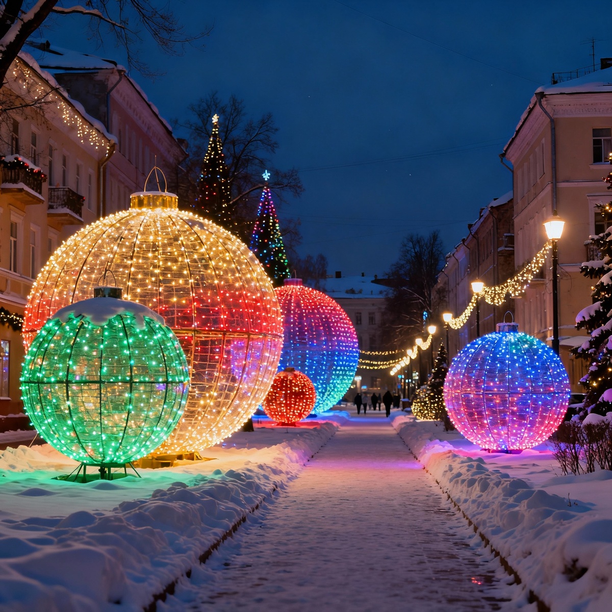 - Огромные световые шары (3–5 м и более) служат эффектными арт-объектами, способны полностью изменить внешний вид площади или парка, став центром праздничных мероприятий. Они устанавливаются на площадях, возле крупных магазинов, в парках и на городских аллеях.