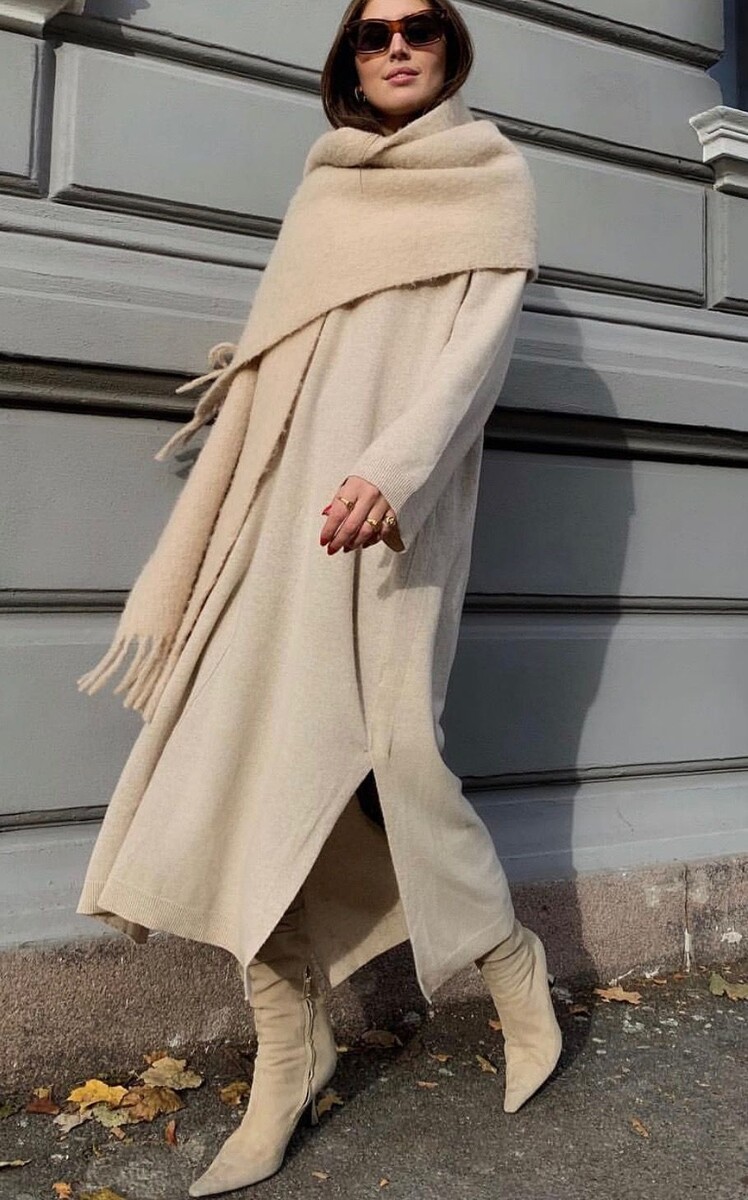 - Размер и фактура: Большой, объемный шарф- из мягкой шерсти, кашемира или мохера. Он должен быть таким, чтобы в него можно было укутаться с головой.
