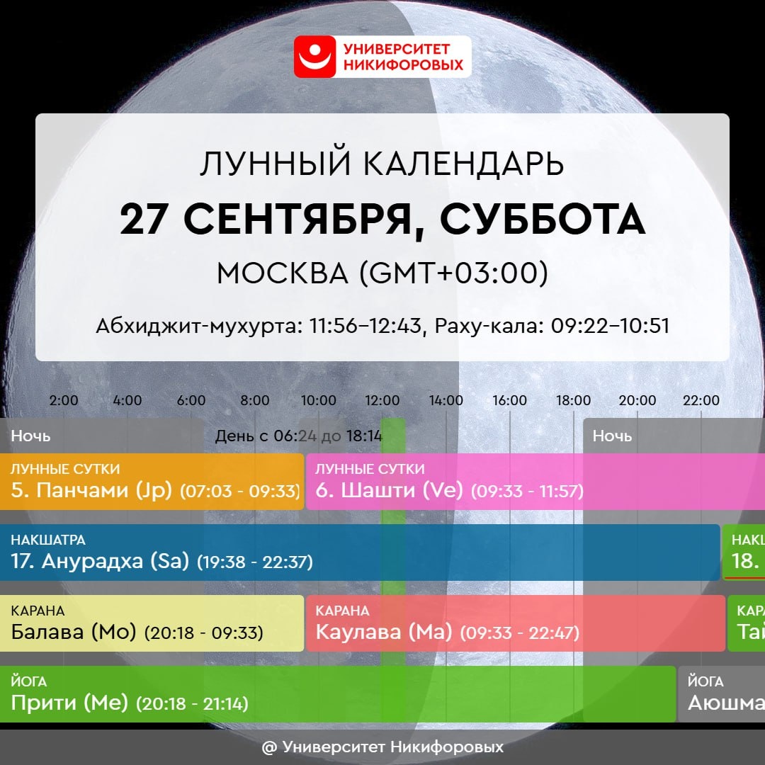 27 СЕНТЯБРЯ, СУББОТА Энергетика дня мягкая, но она приносит эмоциональное беспокойство. Может появиться ощущение, что все не так и ничего не получается. В такой момент стоит обернуться назад, в свое прошлое, и увидеть, какой большой путь вы уже прошли, похвалить себя за все большие и маленькие достижения. Это отличное время, чтобы побыть с друзьями и близкими. Можно собраться на обед или ужин, можно договориться о совместной прогулке, особенно если погода благоприятствует. Поделитесь с ними своими целями и планами, поговорите об обычных рутинных событиях, ведь именно из таких моментов во многом и складывается наша жизнь. Почитайте сегодня про лотосы, полюбуйтесь их изображениями. Попробуйте их нарисовать даже простым карандашом или ручкой, не стремясь превратить их в художественный шедевр, а просто делая это для собственного удовольствия и гармонизации энергий этого дня. Сегодня шестой из девяти дней Наваратри. Это время для поклонения богине Катьяяни, плодами которого может стать