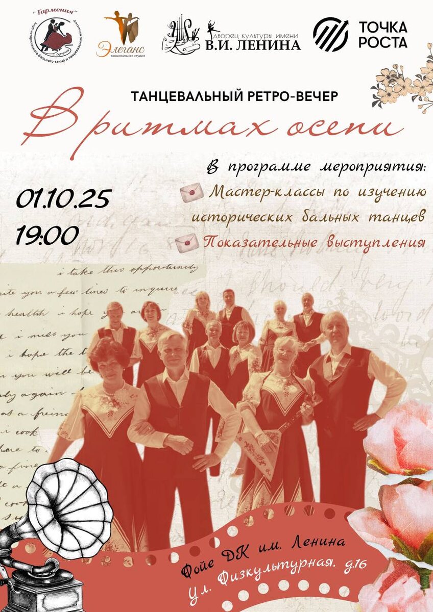 ✨ Танцевальный ретро-вечер «В ритмах осени» 🌟Клуб исторического бального танца и танцевальных миниатюр «Гармония» вместе со студией бального танца «Элеганс» приглашают вас окунуться в атмосферу элегантности и романтики. В программе: 🍁Мастер-классы по изучению исторических бальных танцев 🍁Показательные выступления, где вы сможете насладиться грацией и красотой старинных танцев 🚫 Возраст: 55+ 📆 01.10.2025 🕒 19:00 🏢 ДК им. В.И. Ленина 📍 г. Серпухов, ул. Физкультурая, д.16 💰 Вход свободный❗️ ⭐Поддержать канал голосом 💰 Вакансия - курьер в Серпухове ✅ Мероприятия Серпухов https://dzen.ru/id/66f01c6eb4c6fe60c9ca1608 http://vk.com/serpukhov_events http://dzen.ru/serpukhov_events