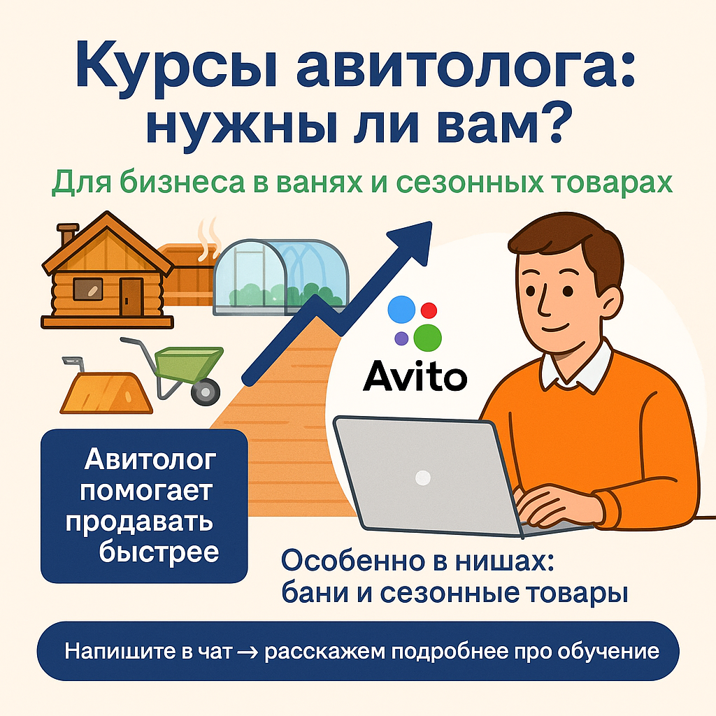 Сегодня Авито — это не просто сайт объявлений, а огромный рынок, где можно продавать всё: от строительных материалов до готовых бань и сезонных товаров вроде бассейнов, теплиц или снегоуборщиков. Но конкуренция растёт, и бизнесу становится всё сложнее выделяться. В ответ на это появилась новая профессия — авитолог, специалист по Авито. Её можно освоить на специализированных курсах. Но возникает вопрос: а стоит ли предпринимателю, который уже занимается бизнесом (например, строительством бань или продажей сезонных товаров), идти на такие курсы самому? На курсах учат: Фактически, курсы делают из новичка специалиста по Авито, который может либо работать как отдельный эксперт, либо продвигать свой бизнес самостоятельно. Продажа бань — это сложный продукт с высокой ценой. Один заказ может приносить сотни тысяч рублей. Курсы авитолога помогут понять, как правильно настроить объявления: У сезонных продаж есть особенность — важно поймать момент спроса. Теплицы весной, бассейны летом, отопитель