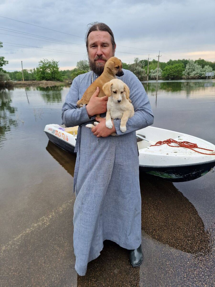 Это был первый выезд в затопленный Херсон. Отец Дмитрий Кротков с МЧС Крыма искали на лодках пострадавших. Наткнулись на заброшенный завод, услышали лай — там были маленькие щенята. Забрать их не смогли, глубина воды достигала 12 метров, а лодки были переполнены людьми и продуктами. На следующий день отец Дмитрий снова поплыл к щенятам. Забрал, отмыл и пристроил в добрые семьи. Вместе с продуктами для людей привозили много кормов для животных. Снимали собак даже с заборов и крыш, чтобы спасти их. Когда случаются ЧС, Церковь одна из первых начинает оказывать помощь людям и всем пострадавшим.