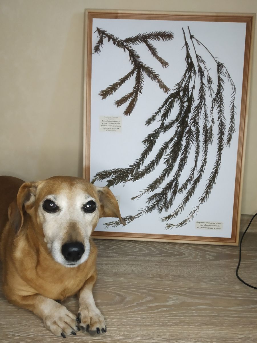 Оформил новое в гербарии-шишкарии, формат А2. Собака Лора для масштаба )) В лесах встречается ель обыкновенная (Picea abies) как с компактным типом