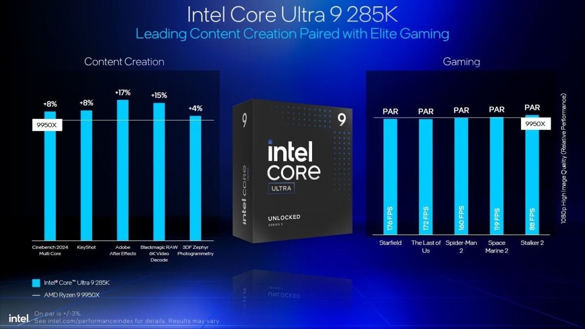 ▪️ 🎮 Core Ultra 285K отстает от флагмана Ryzen 9950X3D всего на 5-9% в хардовых играх.