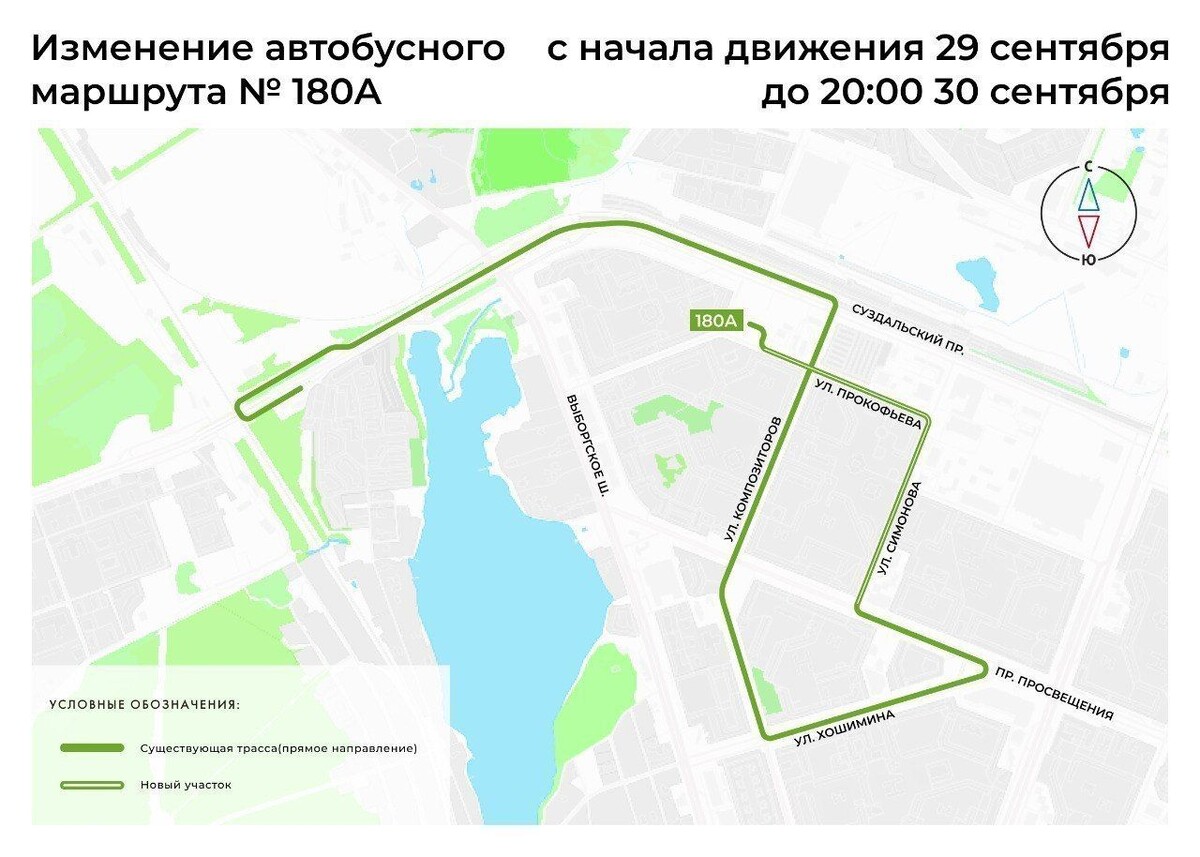 В связи с ремонтом дорожного покрытия на Выборгском шоссе с 29 сентября по 1 октября 2025 года вводятся изменения в движение автобуса №180А «Автобусная станция «Ул. Жени Егоровой» – ЖК «Новая Скандинавия». С начала движения 29 сентября до 20:00 30 сентября: в прямом направлении маршрут изменён до ул. Прокофьева по обычной трассе, далее по ул. Прокофьева, ул. Симонова, пр. Просвещения, затем по действующей трассе. В обратном направлении трасса сохраняется без изменений. С 20:00 30 сентября до 20:00 1 октября в прямом направлении маршрут остаётся, как в первый период: через ул. Прокофьева, ул. Симонова, пр. Просвещения. В обратном направлении маршрут изменён по действующей трассе до пр. Просвещения, затем по пр. Просвещения, ул. Симонова, ул. Прокофьева, ул. Жени Егоровой. Ранее сообщалось, что автобус № 29 изменит маршрут из-за футбольного матча.