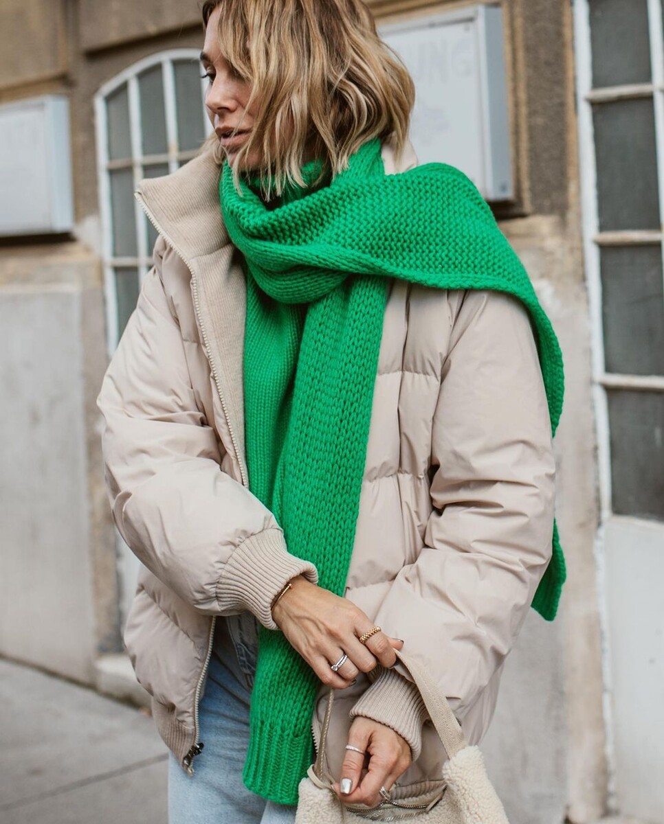- С массивным пальто/пуховиком — объемные, длинные шарфы крупной вязки.