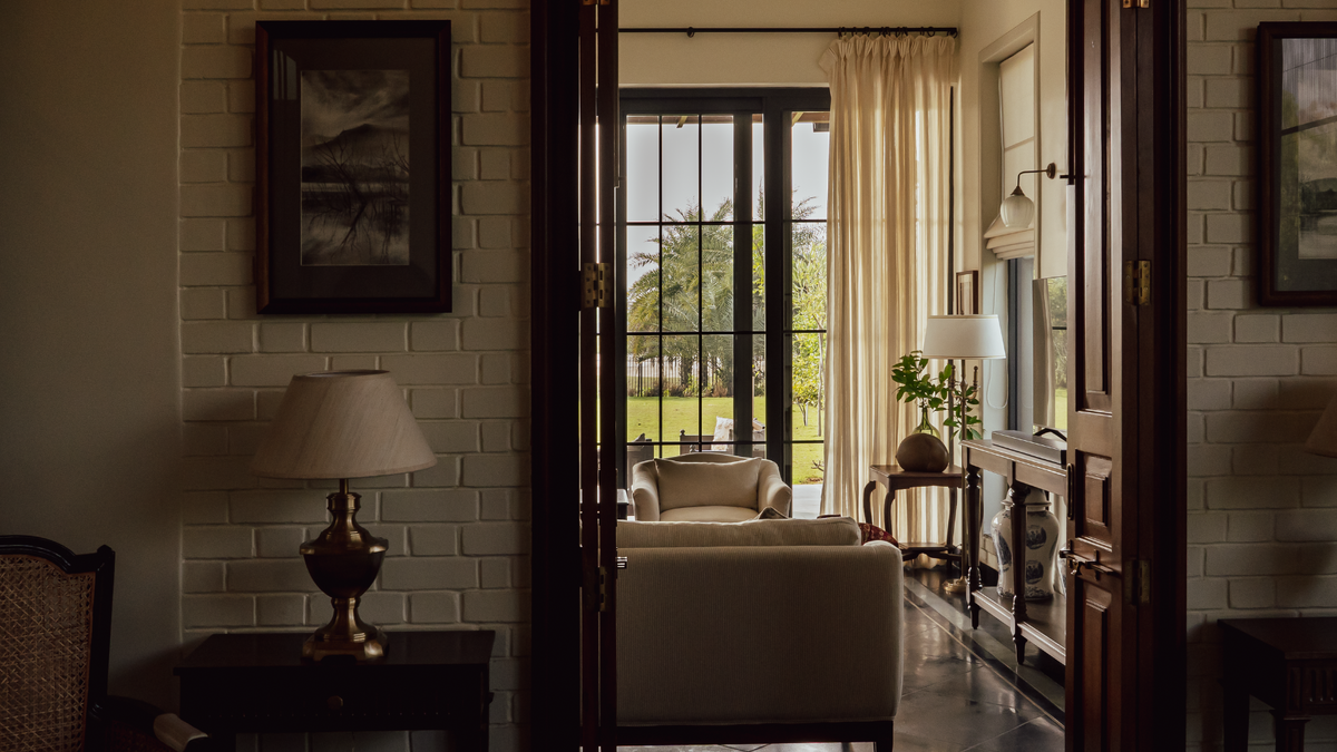 Такие слова, как «модульный», «быстровозводимый» и «под ключ», по праву занимают своё место в мире дизайна. Однако этот дом для отдыха в Ахмадабаде не относится ни к одной из этих категорий. Здесь каждая подушка сшита на заказ из ткани, которая идеально сочетается с цветовой палитрой дома. Пол во внутреннем дворике выложен вручную из шести видов местного камня. А в ванных комнатах уложена многослойная плитка всё той же ручной работы, которую дополняют люстры, винтажные бра, антикварные зеркала и раковины из натурального мрамора. При проектировании дома внимание к деталям было не просто важным, а почти священным. В конце концов, клиенты Вибхи Худы, Пуджа и Кунал Шах из Aurus Jewels в Ахмадабаде, вряд ли согласились бы на что-то меньшее. “Посмотрев на их украшения и понаблюдав за их образом жизни, я представила себе этот дом. Величественный дом, отражающий их бренд. Дом, где они могут валяться на удобных диванах в гостиной, работать над своими проектами и проводить встречи в закрытом вну