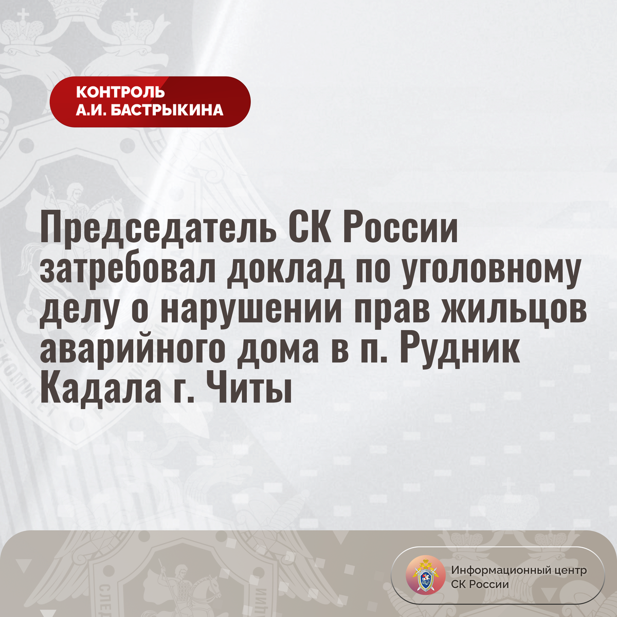 Председатель СК России затребовал доклад по уголовному делу о нарушении прав жильцов аварийного дома в п. Рудник Кадала г. Читы В приёмную Председателя СК России А.И. Бастрыкина «ВКонтакте» поступило обращение по вопросу нарушения прав жильцов многоквартирного дома на улице Новой поселка Рудник Кадала города Читы Забайкальского края. Здание 1971 года постройки находится в непригодном состоянии: кровля повреждена и протекает, деревянные перекрытия прогнили, в конструкциях образовались многочисленные трещины и повреждения. В 2021 году строение признано аварийным, однако, несмотря на наличие угрозы обрушения, расселение запланировано лишь на 2036 год. Обращения в различные инстанции и вынесение судом решения в пользу семьи заявительницы результатов не принесли, до настоящего времени благоустроенное жилье им не предоставлено. В СУ СК России по Забайкальскому краю возбуждено уголовное дело. Председатель Следственного комитета Российской Федерации Александр Иванович Бастрыкин затребовал у ру