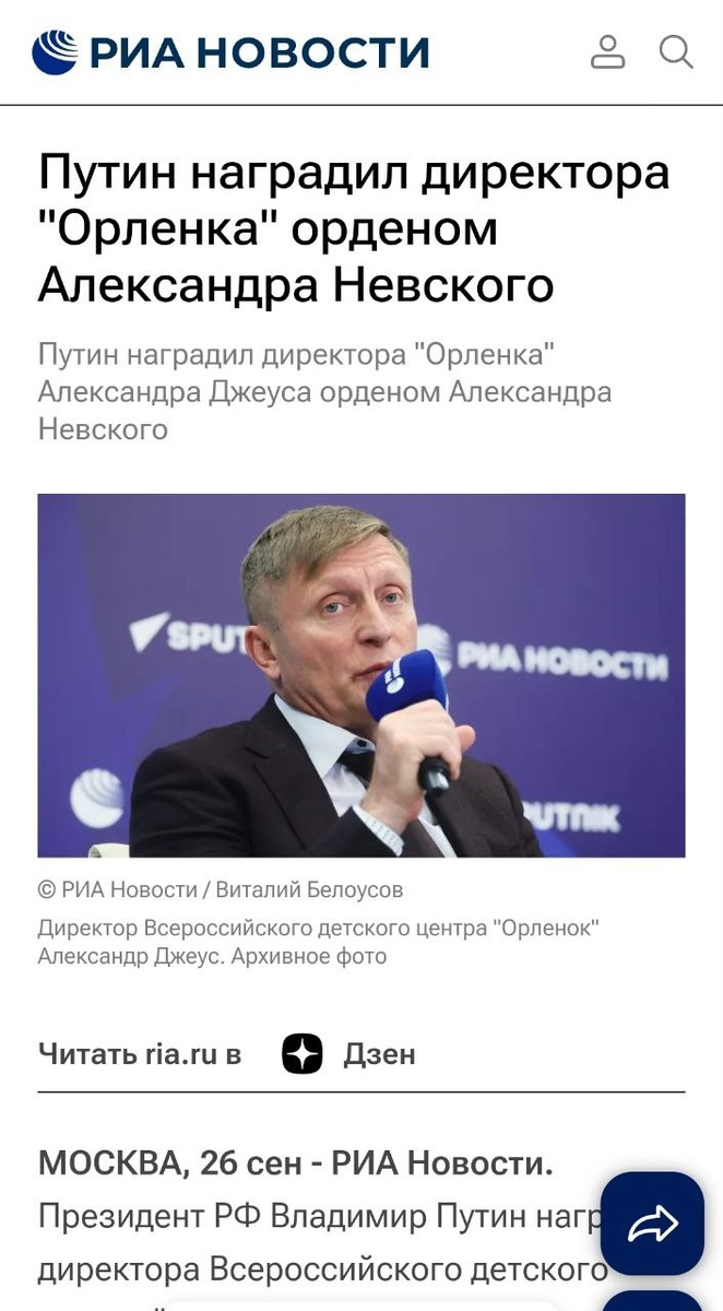 Путин В. В наградил директора "Орленка" орденом Александра Невского. Поздравляем Александра Васильевича Джеуса с достойной наградой за достойный труд на поприще детского отдыха, образования и оздоровления. https://ria.ru/20250926/orlenok-2044610167.html