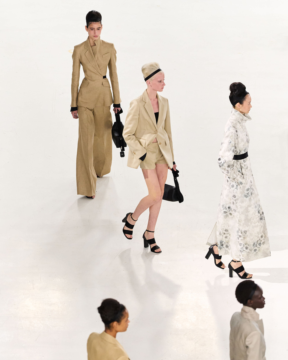 Коллекция получилась смелой и слегка провокационной: тут были укороченные топы и жакеты, открытые спины и плечи, мини и чёрные эластичные ленты, напоминавшие элементы шлей и корсетов. Неожиданно мало было верхней одежды — фирменной для Max Mara, но укороченные тренчи наверняка станут бестселлерами, как и узкие костюмы. В цветовой гамме доминировали беж и кэмел с редкими вкраплениями призрачных цветочных и подводных мотивов, что однозначно уводит коллекцию в сторону минимализма, а не максимализма, активно обсуждаемого в Милане.