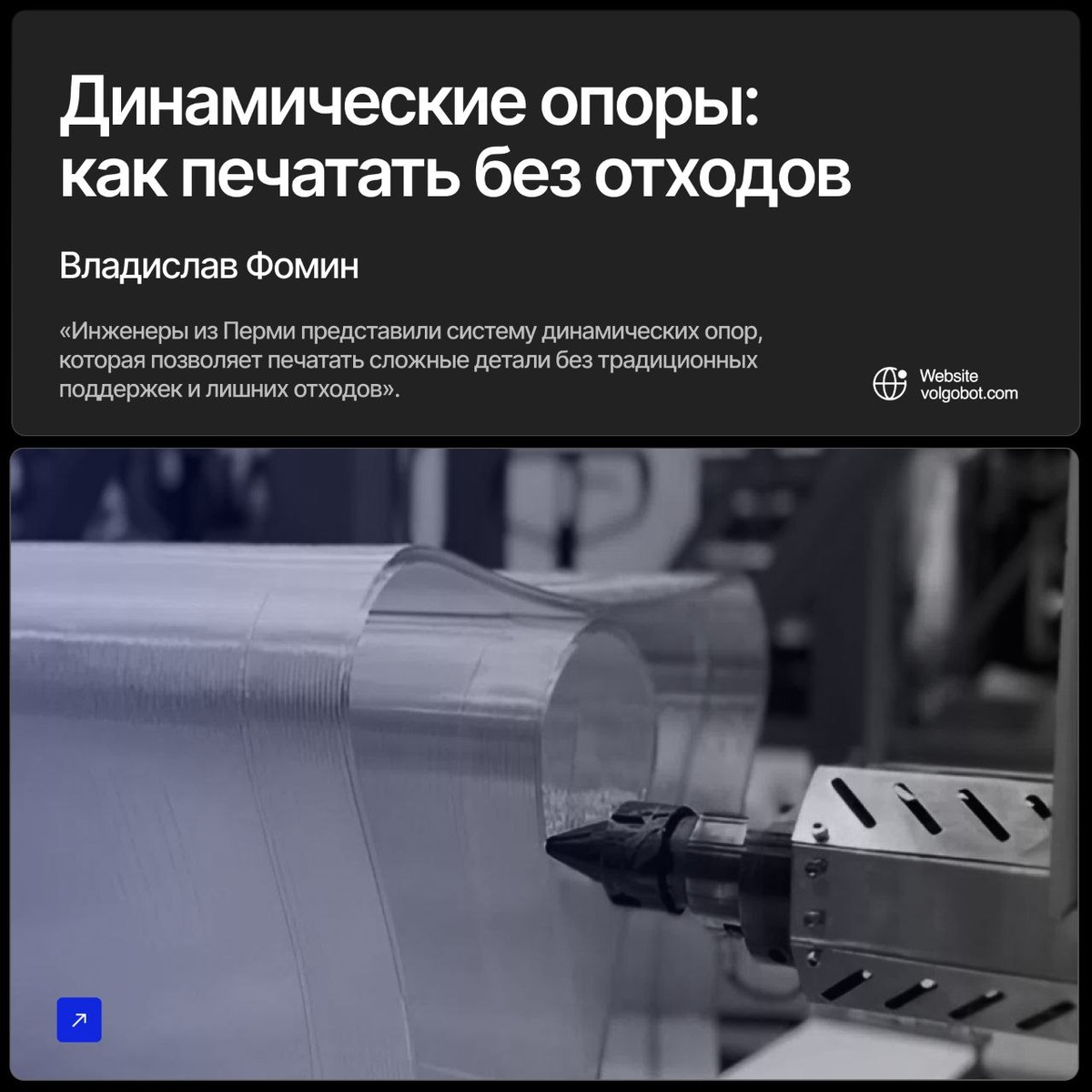Динамические опоры: как печатать без отходов Пополняем рубрику «Новости о мире 3D-печати». Инженеры из Перми представили систему динамических опор, которая позволяет печатать сложные детали без традиционных поддержек и лишних отходов. Принцип работы технологии выглядит следующим образом: • Цифровое планирование – специальное ПО анализирует 3D-модель и вычисляет точки, где потребуется поддержка в процессе печати. • Механическая поддержка – встроенные в принтер подвижные опоры выдвигаются именно в нужный момент, подстраиваясь под геометрию изделия. • Бесконтактное завершение – после печати слоя опоры автоматически убираются, не оставляя следов на поверхности детали. Система универсальна и может быть адаптирована для различных типов экструзионных 3D-принтеров. Технология уже запатентована и успешно протестирована на промышленном оборудовании. Такое решение позволяет значительно снизить затраты на материалы и постобработку, повышая эффективность производства. Это наглядный пример того