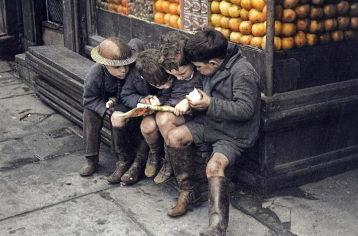 Ливерпуль, 1940 год. Мальчик в самодельной оловянной шляпе позирует с друзьями возле местного магазина. Берт Харди, фотограф журнала Picture Post, запечатлел момент детской изобретательности военного времени. Оловянные листы использовались для консервных банок, но в условиях дефицита дети приспосабливали их для игр и самодельных головных уборов.