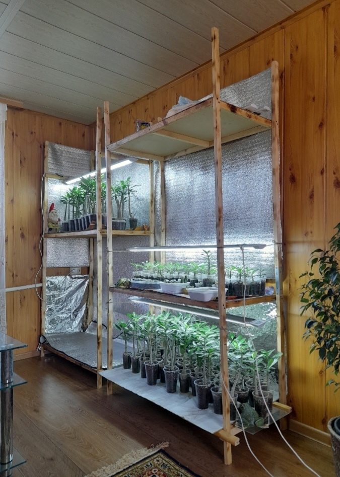 Приветствую вас, мои читатели🤗 Осень в разгаре, адениумы расположились дома на зимовку, а потому будет не лишним рассказать немного о самом близком им предмете, который теперь часто будет появляться в кадре. И это стеллаж. Раньше, когда я только начинала разводить адениумы, они жили на подоконнике. Их тогда было мало, и сами они были маленькие, места много не занимали. Помню, как я исхитрялась и устраивала им подогрев, в таком масштабе мне это удавалось. Я их и дальше планировала держать зимой на подоконниках, но очень скоро выяснилось, что это нереально. Подоконники у меня холодные, хотя всё везде заделано, щелей нет, и холоду вроде бы неоткуда пробраться. Тем не менее атмосфера там царит очень и очень прохладная. Не спасает положение даже фольгированный утеплитель, которую я стелю на подоконник. Для адениумов там всё равно слишком низкая температура. Пришлось срочно менять планы. На скорую руку смастерила подобие стеллажа по принципу "я его слепила из того, что было". Это было н