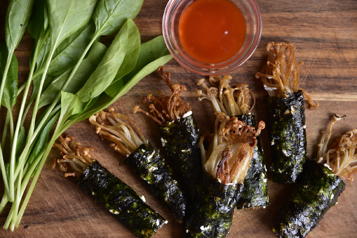 Привет, наши дорогие любители вкусных открытий! 👋 Сегодня мы покажем вам, как приготовить бомбическую закуску: Эноки от "Есть Грибы", завернутые в хрустящие листы нори с нежной рикоттой и чуточкой чили! 🌶️🌿 Шаг 1: Готовим Эноки на сковородке. Эноки разделяем на небольшие пучки. На хорошо разогретой сковороде с небольшим количеством масла быстро обжариваем их с двух сторон до появления легкой золотистой корочки. Маленький секрет: солим очень-очень мало, только с одной стороны! Шаг 2: Собираем рулетик – это почти магия! Берем лист нори. Намазываем на него тонкий слой рикотты. Сверху кладем обжаренный пучок Эноки. Можно еще посыпать хлопьями чили для дополнительной остроты! Шаг 3: Заворачиваем! Аккуратненько сворачиваем нори с начинкой в плотный рулетик.