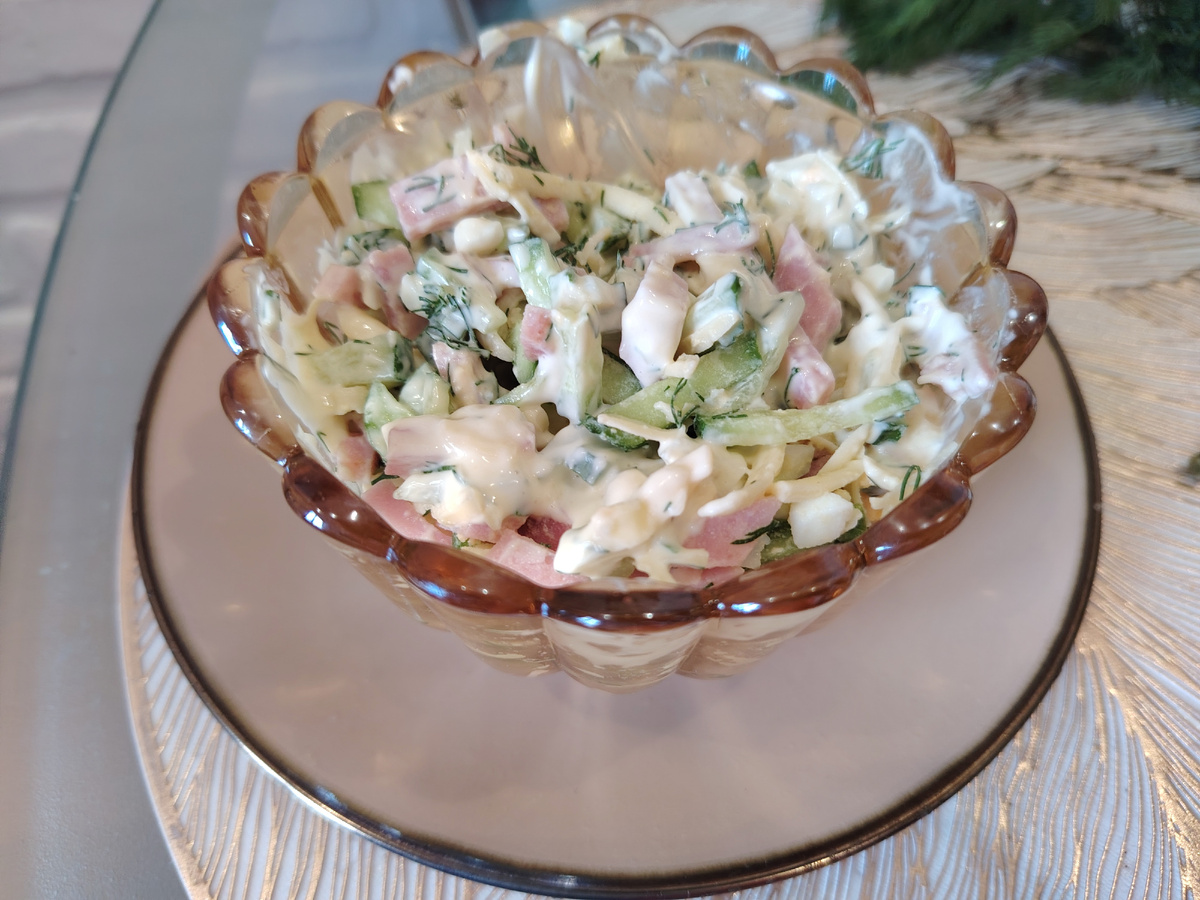 Готовлю салат "Нежность" Для приготовления этого салата нам потребуется: Кусочек ветчины Кусочек сыра Несколько свежих огурчиков 3-5 куриных яиц товарных вкрутую Пучок укропа 3-4 зубчика чеснока Соль, перец по вкусу Для заправки майонез. Я не указываю точное количество продуктов, вы сами решайте, это зависит от того на сколько человек вы хотите приготовить. Нас в семье 3 человека и поэтому я сразу готовлю побольше. Этот салат я впервые попробовала в "Спаре " мне понравился и теперь я его готовлю дома, для своей семьи, домашний салат получается гораздо вкуснее магазинного. Натираем сыр на крупной тёрке. Затем отварные куриные яйца. Яйца я нарезаю при помощи вот такой яйцерезки, очень удобно и быстро. Затем нарезаем соломкой ветчину. Затем нарезаем свежие огурцы тоже соломкой. Вот так все у меня получилось, осталось добавить укроп и чеснок. Укроп мелко режим и чеснок пропускаем через чеснокодавку, или кому, как удобнее измельчить чеснок. Добавляем соль, перец по вкусу, можно