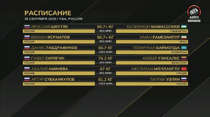 А теперь переносимся в Уфу. Нас ждет захватывающий боксерский вечер IBA. PRO 9 🥊 Главный бой – противостояние россиян Субханкулова и Узляна. На кону стоит титул WBA Continental в легком весе 🏆 ⚔ В со-главном поединке Силягин будет боксировать с Гонсалесом за титул IBA.Intercontinental во втором среднем весе. Смотрим бокс на Матч! Боец. ССЫЛКА НА ТРАНСЛЯЦИЮ 👈