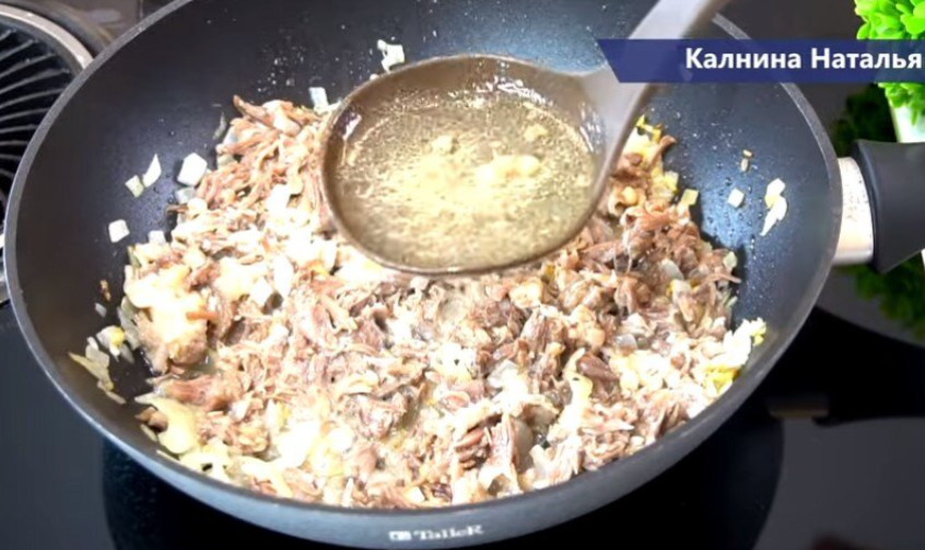 На сковороду наливаем масло обжарим лук на небольшом огне до полупрозрачности, добавляем мясо, обжариваем пару минут и вливаем 2 половника бульона и потушим минут 5.