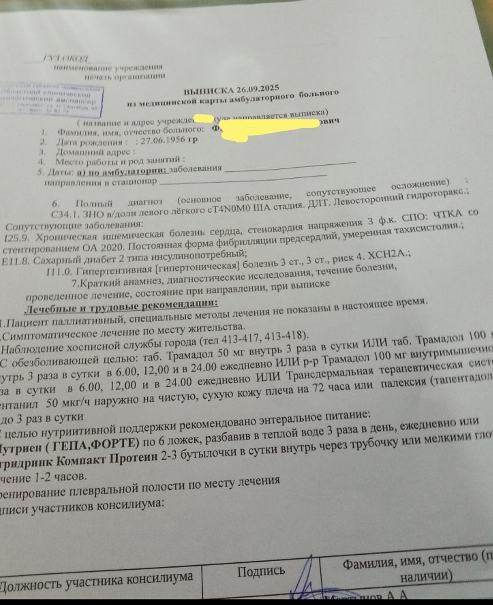 Мы попросили врачей, чтоб нам выписали лекарства для облегчения боли и жизни человека. Врачи посоветовали нам обзавестись кислородным концентратором для домашнего пользования, чтобы легче было дышать, так как одно легкое уже не работает, болеутоляющие и сердечные лекарства.