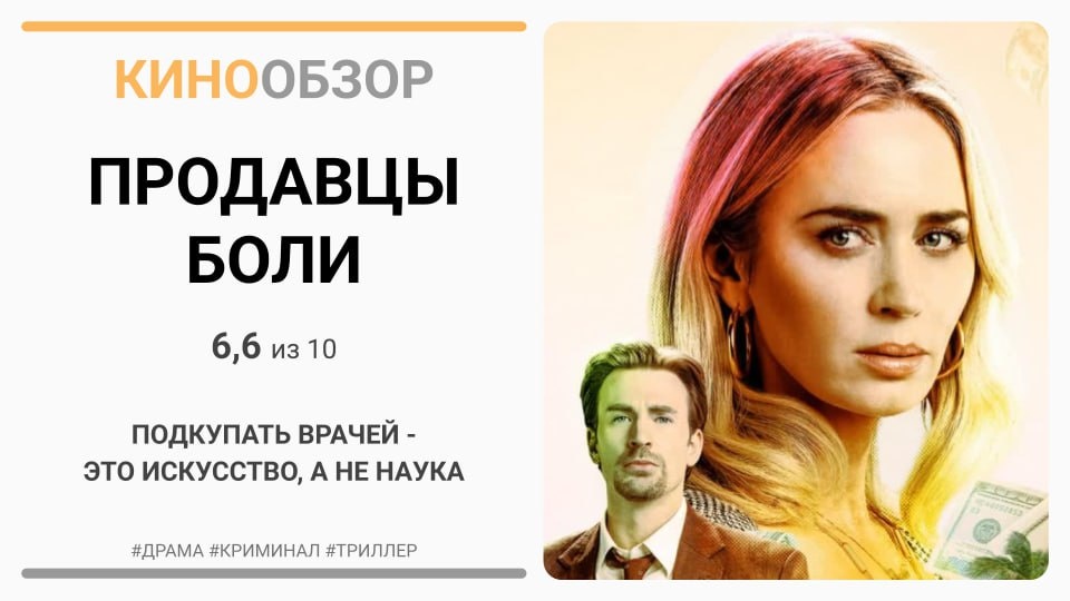 🎥 КИНООБЗОР Продавцы боли (Pain Hustlers), 2023 Жанр: Драма, криминал, триллер Рейтинг: 6,6 из 10 (IMDB) Сюжет: Тёмная драма о фармацевтическом маркетинге и этических компромиссах в гонке за прибылью. Главная героиня попадает в компанию, где агрессивные продажи и сомнительные схемы ставятся выше безопасности пациентов, что ведёт к мошенничеству и трагическим последствиям в масштабах эпидемии. Цитаты из фильма: - «Мы не лечим людей. Мы продаём надежду» - «Деньги — это язык, который понимают все» - «Когда все в игре, никто не смотрит на последствия» Темы: Продажи, маркетинг, этика в медицине, корпоративная жадность, кризис. Кому будет интересно: Тем, кто занимается продажами, любит расследования и драмы о морали и ответственности в бизнесе. Интересные факты: - В картине главную роль исполнила Эмили Блант; в актёрском составе также присутствуют Крис Эванс и Энди Гарсия. - Фильм вдохновлён журналистскими расследованиями и историей опиоидного кризиса в США — показывает механики п