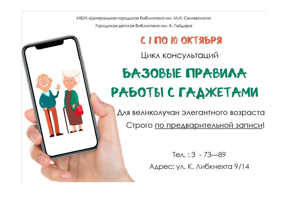 ЦГБ Семевского приглашает на бесплатные компьютерные курсы пожилых людей 📌 Центральная городская библиотека им. М.И. Семевского приглашает пожилых людей на бесплатные курсы компьютерной грамотности «Компьютерная неотложка». Проект приурочен ко Дню пожилых людей. ✨ Программа включает обучение работе в Windows, Word, Интернете, использованию Портал госуслуг и основам кибербезопасности. Занятия пройдут с 1 по 10 октября 2025 года. - Курсы «Компьютер: навыки работы» 📍 ЦГБ им. Семевского (ул. Пионерская, 7), запись по тел. +7 (81153) 3-64-59. - Базовые правила работы с гаджетами 📍 ГДБ им. Гайдара (ул. К. Либкнехта, 9/14), запись по тел. +7 (81153) 3-73-89. 👉Подписывайтесь на ВЛуки.ру