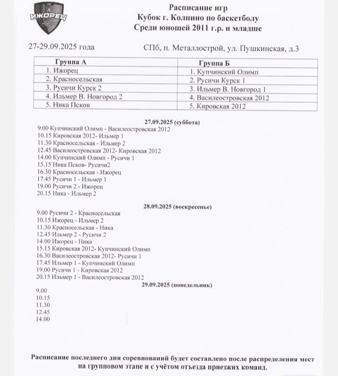 📆 Завтра, 27 сентября, в Санкт-Петербурге начинается турнир 🏆 «Кубок Колпино» по баскетболу 🏀 среди юношей 2011 года рождения