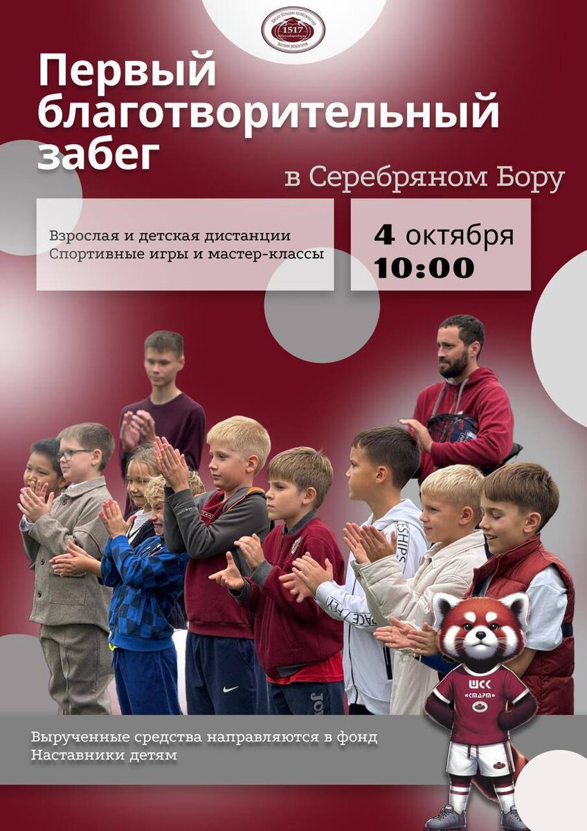 Дорогие ребята! Уважаемые родители! Приглашаем вас принять участие в Первом благотворительном забеге #школа1517! 🏃🏼🏃🏻♀️ 📅4 октября 📍Серебряный Бор ⏰Сбор гостей с 10:00 ❗️Регистрация участников по ссылке 🏃🏻♀️Каждый ваш шаг на этом забеге – это шаг навстречу будущему, где у каждого ребёнка есть шанс на счастливую и полноценную жизнь. Все собранные средства будут направлены в поддержку программы «Наставники детям» (МОО «Старшие Братья Старшие Сестры»), которая помогает детям-сиротам найти своих значимых взрослых в лице персональных волонтеров-наставников. Вместе мы подарим им заботу, поддержку и веру в себя! С нетерпением ждём вас на старте! Вместе мы сделаем этот забег не просто спортивным событием, а настоящим праздником добра и солидарности! 💪 Давайте бежать не только за себя, но и за тех, кто нуждается в нашей поддержке! 🙋🏻♀️Готова ответить на ваши вопросы заместитель директора Евгения Алексеевна Нечаева ☎️ +7-903-960-01-69 #внимательнаяшкола #мы1517