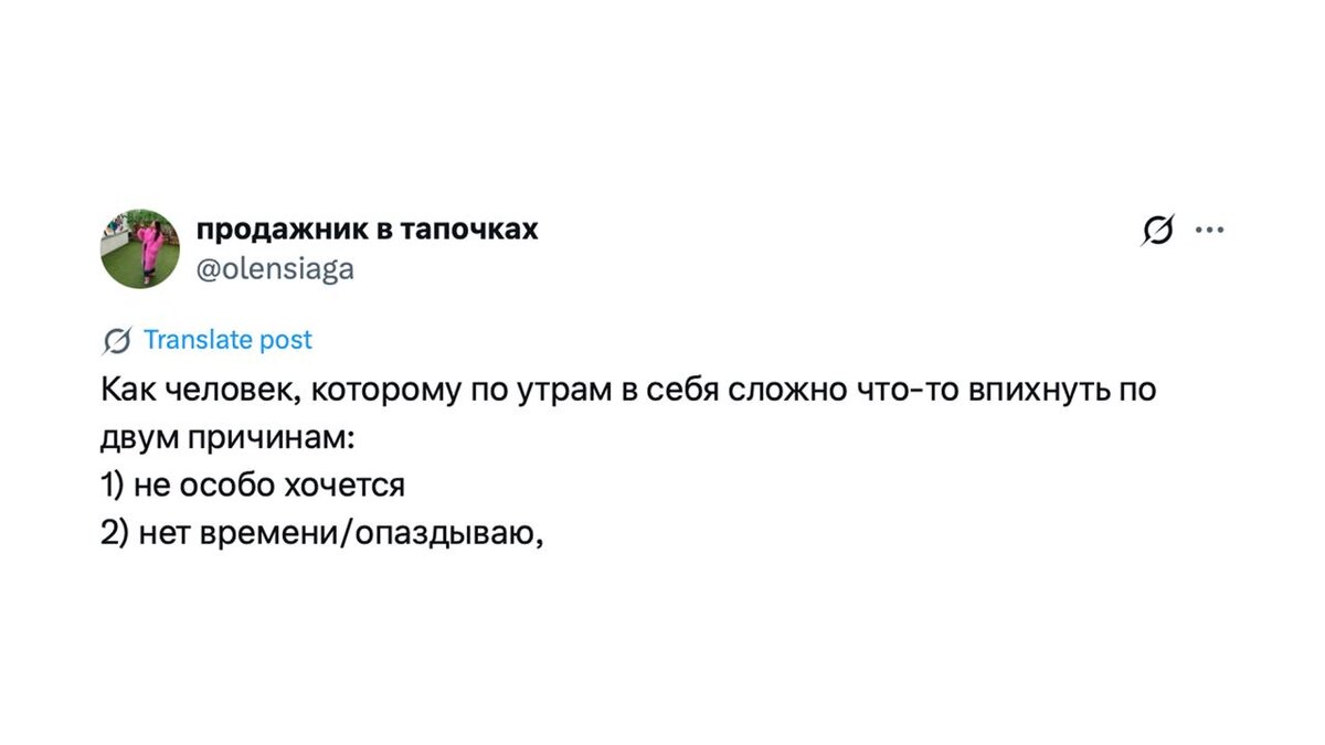 Полноценные приемы пищи или перекусы Некоторые признаются: завтрак для них — самый сложный прием пищи. Другие честно пишут, что целый день могут «кусочничать», а вечером съедают сразу двойную порцию. Многие считают, что завтрак это не про время, а про первый прием пищи, хоть в девять утра, хоть в два дня. Мы заглянули в соцсети и нашли самые разные взгляды на еду. А какой у вас идеальный формат питания: расписание или импровизация? #газета_социум