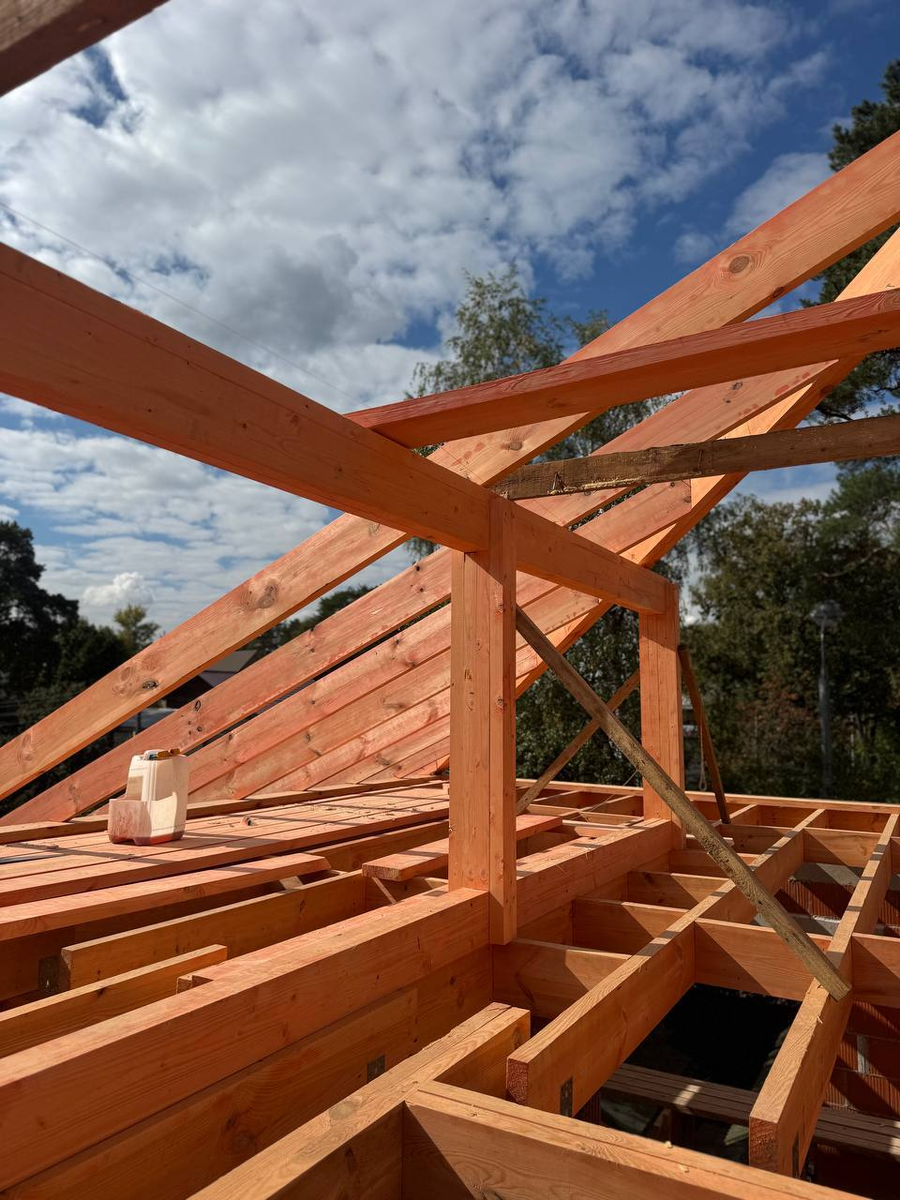 Когда стены подняты и перекрытия установлены, приходит время для устройства крыши. Это этап, где важно не только качество материалов, но и профессионализм в монтаже. 🔸 Скатная или плоская? Скатная кровля — классика для частных домов. Хорошо отводит воду и снег, позволяет обустроить мансарду. Подходит для регионов с большим количеством осадков. Плоская кровля — современный тренд. Дает дополнительное пространство (терраса, эксплуатируемая зона), но требует грамотной гидроизоляции и ухода. 🔸 Монтаж и соединение элементов Основа — стропильная система. Она должна быть рассчитана инженером с учетом нагрузок (снег, ветер, собственный вес). На стропила укладывается обрешетка, к которой крепится кровельный материал. Места стыков (ендовы, коньки, примыкания к трубам и стенам) — самые уязвимые. Здесь используют доборные элементы и герметизирующие ленты. Ошибка в этих узлах = протечки. Важно предусмотреть вентиляцию подкровельного пространства — это защищает утеплитель и продлевает срок службы к