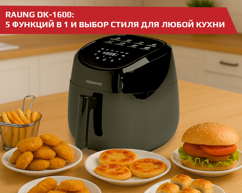 Аэрогриль Demiand Raung DK-1600 — это многофункциональный прибор, который заменяет сразу пять кухонных устройств. Он берёт на себя роль духовки, фритюрницы, электрошашлычницы, микроволновки с грилем и дегидратора. Всё это в компактном корпусе, который не занимает много места, но открывает простор для кулинарных экспериментов. 5 устройств в 1 FAST HOT AIR: вкуснее и полезнее Технология циркуляции горячего воздуха Fast Hot Air обеспечивает равномерный обдув продуктов на 360°. Блюда готовятся на 30% быстрее, а благодаря минимальному количеству масла сохраняют пользу и натуральный вкус. Умные функции Цвета, которые отражают Ваш стиль Raung DK-1600 доступен сразу в четырёх цветах: 🤍 Белый — лёгкость и свежесть, идеален для светлых кухонь.