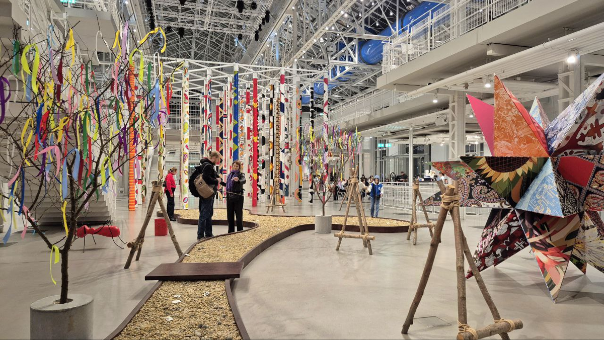 Нижний уровень выставки больше напоминает детскую площадку для игр, чем выставочное пространство. Самый яркий объект — лес из разноцветных «брёвен», композиция из деревянных мачт, раскрашенных яркими узорами. Между ними можно свободно гулять, и это классная «инстаграмная» локация.