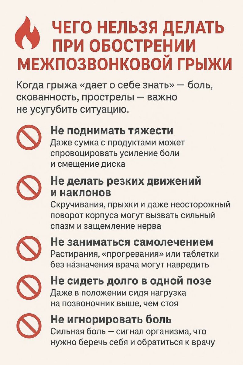 🔥 Чего нельзя делать при обострении межпозвонковой грыжи Когда грыжа «дает о себе знать» — боль, скованность, прострелы — важно не усугубить ситуацию. В острый период стоит помнить о нескольких запретах: 🚫 Не поднимать тяжести Даже сумка с продуктами может спровоцировать усиление боли и смещение диска. 🚫 Не делать резких движений и наклонов Скручивания, прыжки и даже неосторожный поворот корпуса могут вызвать сильный спазм и защемление нерва. 🚫 Не заниматься самолечением Растирания, «прогревания» или таблетки без назначения врача могут навредить. 🚫 Не сидеть долго в одной позе Даже в положении сидя нагрузка на позвоночник выше, чем стоя. 🚫 Не игнорировать боль Сильная боль — сигнал организма, что нужно беречь себя и обратиться к врачу. 💡 В острый период важны покой, щадящий режим и консультация специалиста. А дальнейшее лечение (ЛФК, массаж, физиотерапия) подключается только после снятия обострения. #грыжа #позвоночник #здоровьеспины #остеохондроз #неврология #больвспине #здоро