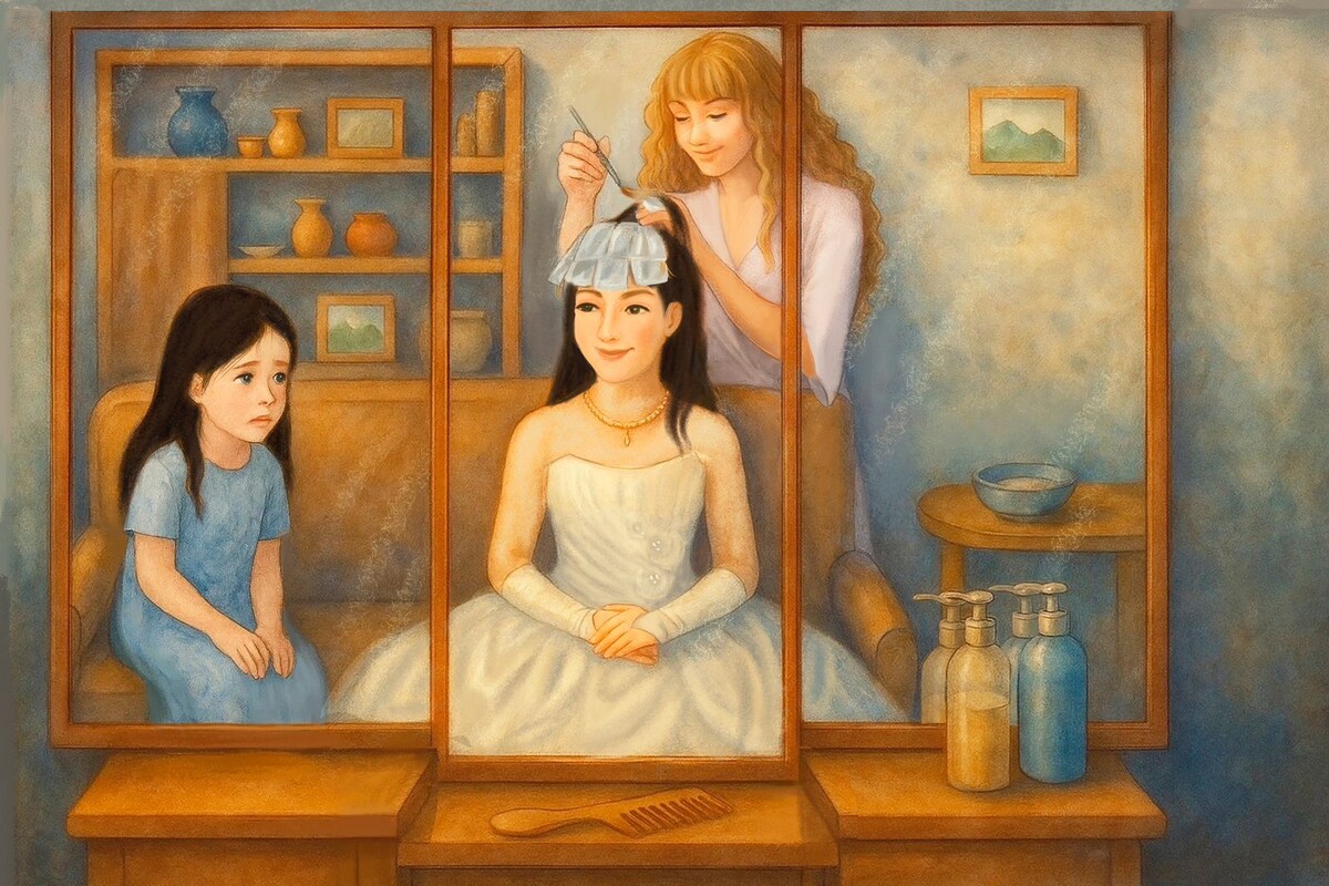 Мама вновь закрыла лицо ладонями, и ее губы дрожали. В этом дрожании читалась не только физическая боль от агрессивного химического воздействия, но и сложное внутреннее состояние. Казалось, она испытывала странное, почти мазохистское удовольствие – словно химия, просачиваясь в ее кровь, с каждой секундой уносила ее всё дальше и дальше от дочери, от прежней себя. Ее дыхание стало хриплым, будто она вдыхала не просто краску, а новый образ – чужой, светлый, не-мамин. Образ, который обещал освобождение или, по крайней мере, радикальные перемены.