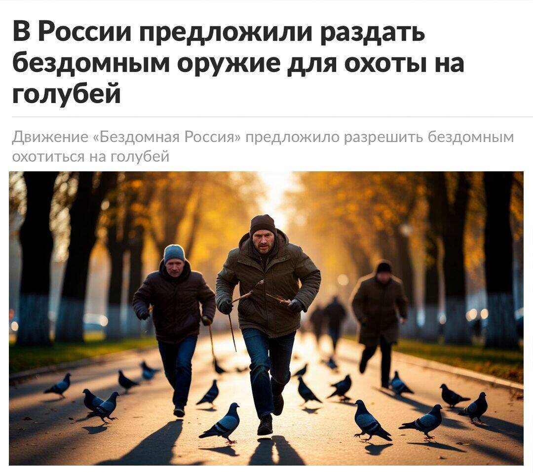 Российских бомжей хотят вооружить пневматикой, чтобы они охотились на голубей. Общественники считают, что от такого решения выиграют все: вооружённые пневматикой бомжи помогут очистить города от пернатых разносчиков инфекций, а сами получат бесплатный источник еды. Кроме того, авторы инициативы предложили обязать отели заселять бездомных в пустующие номера, а россиян, владеющих несколькими квартирами — пускать бродяг на ночлег. 👉Лезвие 18+