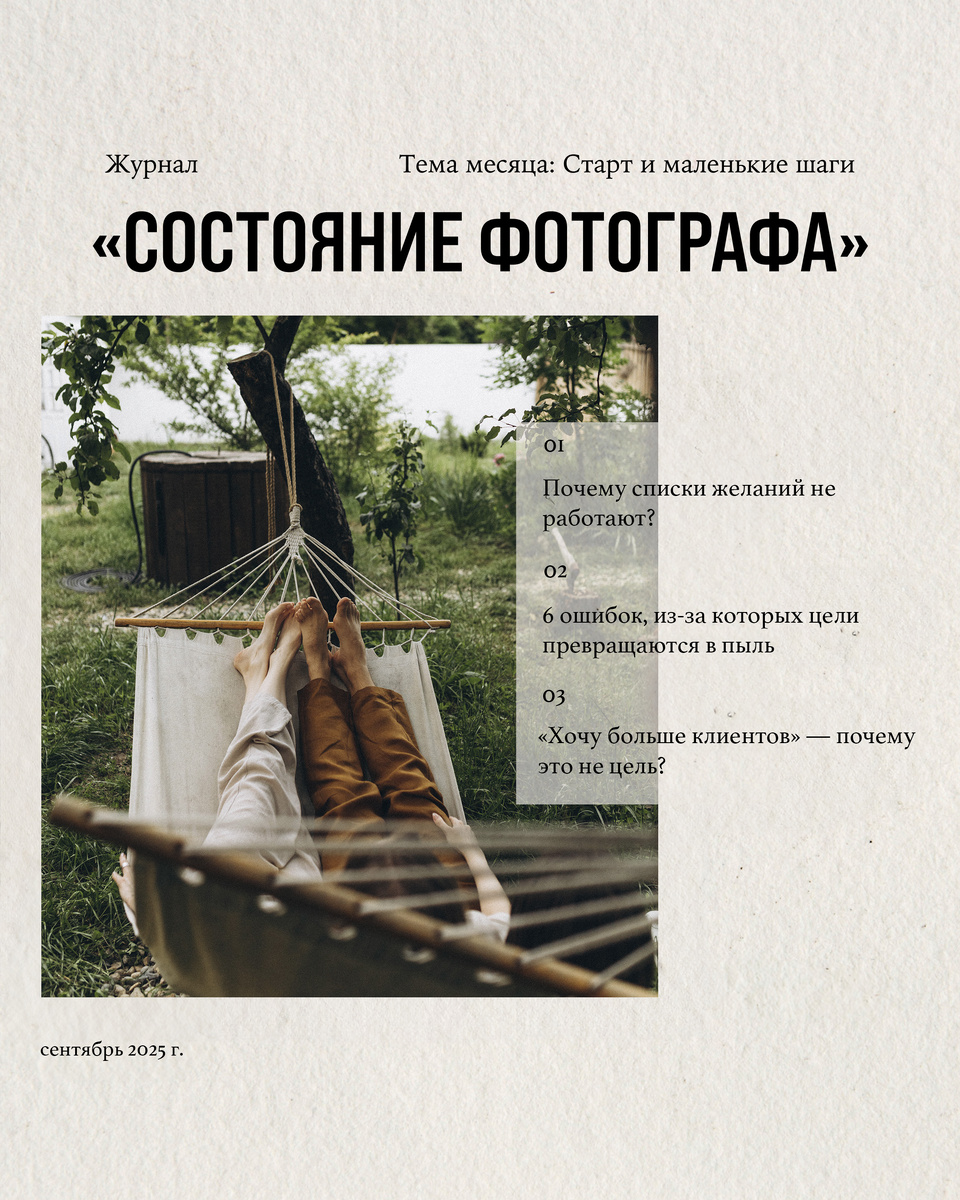 Четвёртый и финальный выпуск первого сезона журнала «Состояние фотографа». Да, друзья, уже месяц пролетел 🔥 Спасибо за вашу активность! Второй сезон начнём сразу на следующей неделе, без пауз и по нашему расписанию. Многие составляют длинные списки: «хочу больше клиентов», «хочу снимать красивые кадры», «хочу зарабатывать фотографией». Но через пару недель эти списки превращаются в пыль. Почему? ⚡️ Потому что список желаний — это не цель. Желание звучит красиво, но не даёт понимания, что конкретно нужно делать и как понять, что результат достигнут. Чтобы цель работала, важно задать себе несколько ключевых вопросов: 1. Цель утверждена положительно ❌ «Не хочу скучных кадров» ✅ «Хочу, чтобы мои фотографии были яркими и живыми» 2. Цель под моим контролем ❌ «Хочу, чтобы меня чаще заказывали» ✅ «Создаю портфолио и учусь привлекать клиентов» 3. Сенсорный опыт ❓ Как я пойму, что цель достигнута? 👉🏻 Когда получаю хорошие отзывы, вижу довольные лица клиентов, чувствую радость от работы. 4. Ко