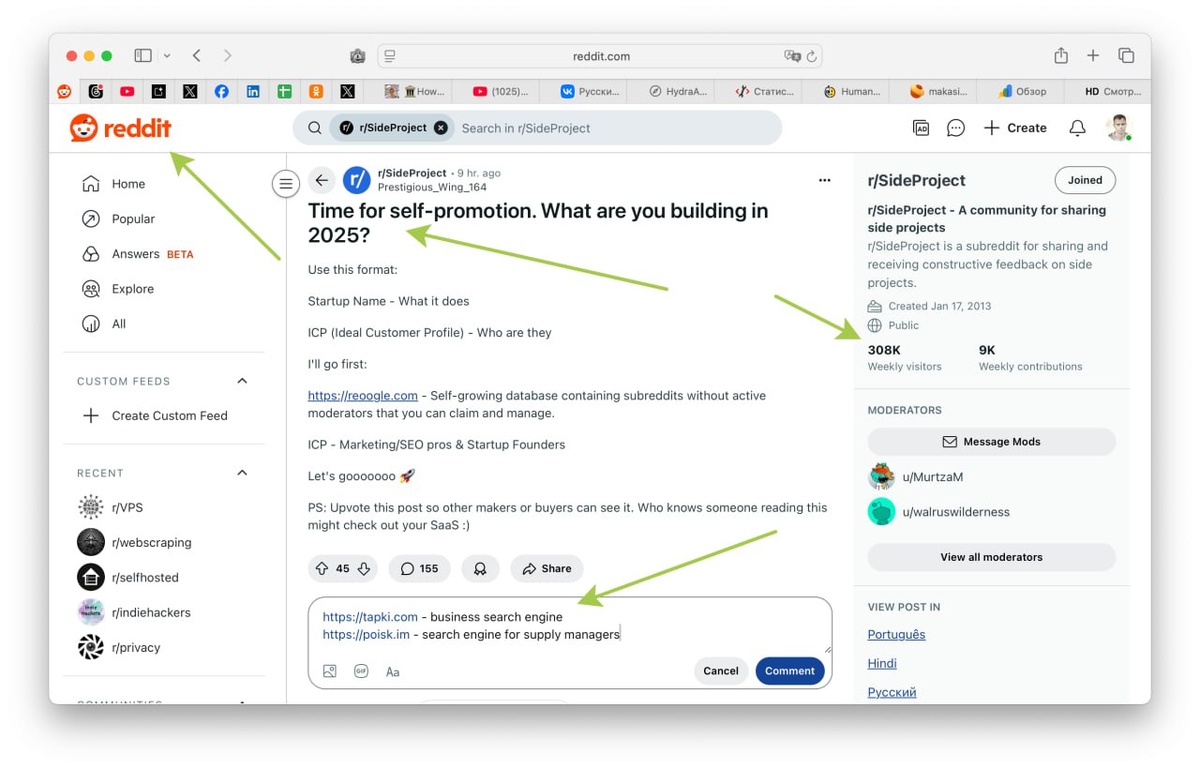 Отслеживайте на Reddit окна возможностей оставить пару ссылок на ваш стартап. Вот, мне попался пост и я сразу побежал размещаться. Занимает 1 минуту, допускаю, что даст некий ссылочный вес (хотя на Реддите ссылки noindex, но кто знает в реальности, как работает Google).