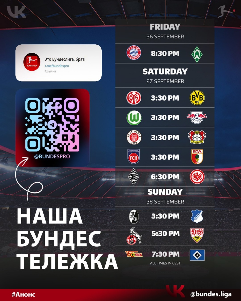 Расписание матчей 5 тура Бундеслиги 🇩🇪 Пятница 26.09.2025 🔥 21:30 Бавария - : - Вердер Суббота 27.09.2025 🔥 16:30 Майнц - : - Боруссия Д 27.09.2025 ⚡ 16:30 Вольфсбург - : - РБ Лейпциг 27.09.2025 🔥 16:30 Санкт-Паули - : - Байер 27.09.2025 ⚡ 16:30 Хайденхайм - : - Аугсбург 27.09.2025 🔥 19:30 Боруссия М - : - Айнтрахт Ф Воскресенье 28.09.2025 ⚡ 16:30 Фрайбург - : - Хоффенхайм 28.09.2025 🔥 18:30 Кельн - : - Штутгарт 28.09.2025 ⚡ 20:30 Унион - : - Гамбург 🆕 Live движ-текстовик по традиции начнём с пятницы в нашей Бундестележке 👉 https://dzen.ru/id/6054fd15e468d146f37d5335 Заранее подпишитесь, чтобы не пропустить важное ✍