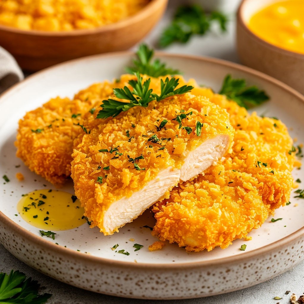 Куриное филе в панировке из кукурузных хлопьев - рецепт, который точно стоит попробовать! Это идеальный вариант, когда хочется чего-то одновременно вкусного и простого. Внутри мясо остается сочным и нежным, а снаружи такая хрустящая корочка, что просто пальчики оближешь. Что нам понадобится: Как будем готовить: 1. Первым делом займемся курицей. Филе нужно нарезать на кусочки, как для отбивных. Если кусочки получатся толстоваты, можно их слегка отбить. Только не перестарайтесь, чтобы мясо не стало слишком тонким. Затем солим, перчим и посыпаем итальянскими травами. Не жалейте приправы, они сделают вкус более насыщенным. 2. В отдельной миске взбиваем яйца с молоком и щепоткой соли. В другую миску высыпаем кукурузные хлопья. Если хлопья крупные, можно их слегка размять руками, чтобы лучше прилипали к курице. 3. Берем каждый кусочек курицы, окунаем его в яичную смесь, а затем тщательно обваливаем в кукурузных хлопьях, чтобы корочка получилась равномерной. Выкладываем наши кусочки