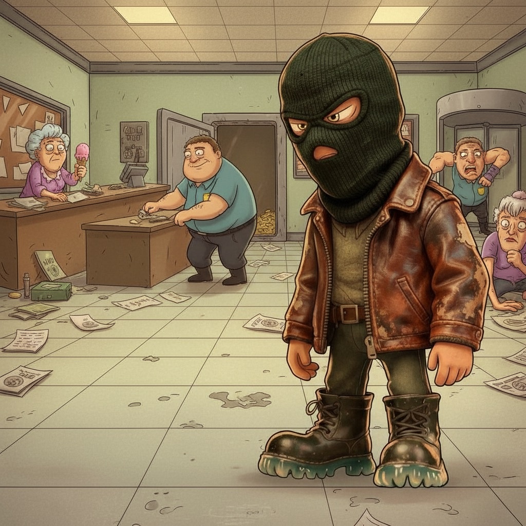 Саймон выломал дверь в лондонский банк, пытаясь выглядеть угрожающе. Маска на лице чесалась, куртка была куплена на распродаже в секонд‑хенде, а ботинки сползали с пяток. Но главное — у него был пистолет. Точнее, Пистолет. Пистолет был не простой: старенький «Вальтер», весь в царапинах, закопчённый, но с характером. Он любил внимание, часто кашлял, как пожилой трактирный завсегдатай, и разговаривал исключительно с британской интонацией — такой, будто ему положено осуждать всё вокруг. — Ну что, Саймон, — заговорил он, едва тот навёл его на кассу, — ты опять своими глупостями занялся? Поясни, зачем ломиться в банк в час дня, когда все чайники кипят и толпа свежа, как булочка из “Greggs”? — Замолчи, — прошипел Саймон, стараясь выглядеть устрашающе. — Тут серьёзное дело! Очередь в банке, однако, отреагировала несерьёзно. Старушка в коляске осмотрела его сверху донизу и сказала соседке: — Да этот юнец даже носки разного цвета надел. Какой из него грабитель? Охранник, облитый чаем, попыталс